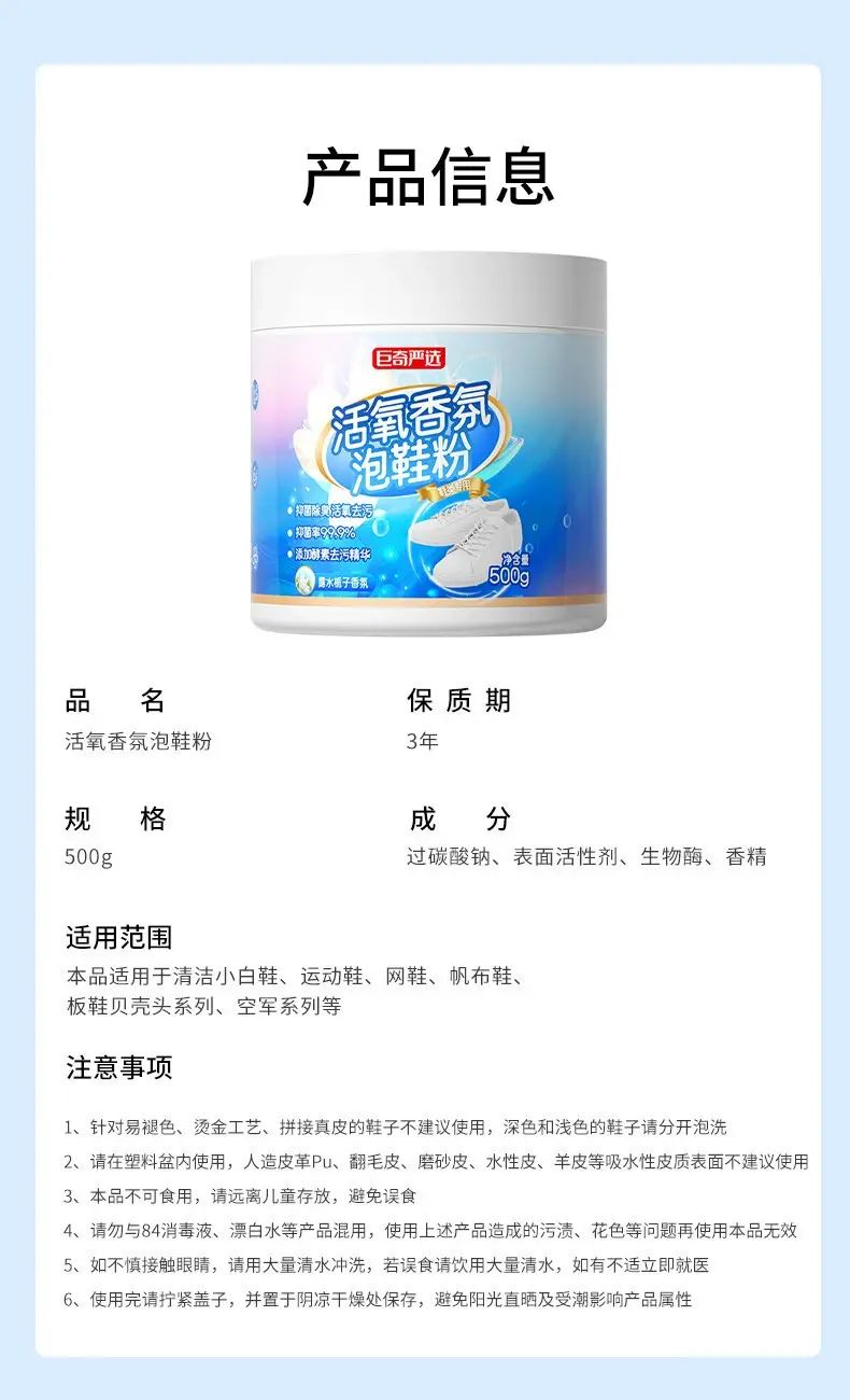 | Description | 巨奇香氛泡鞋粉洗鞋清洁剂刷鞋神器苏打清洁剂运动小白鞋去污500g;;净含量:500g |