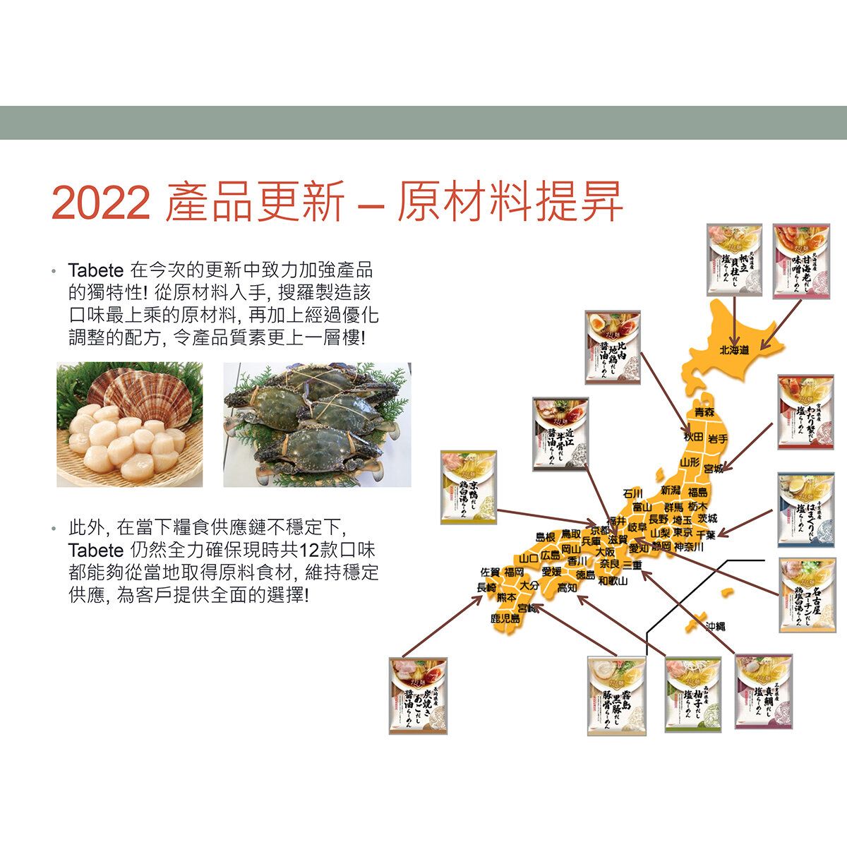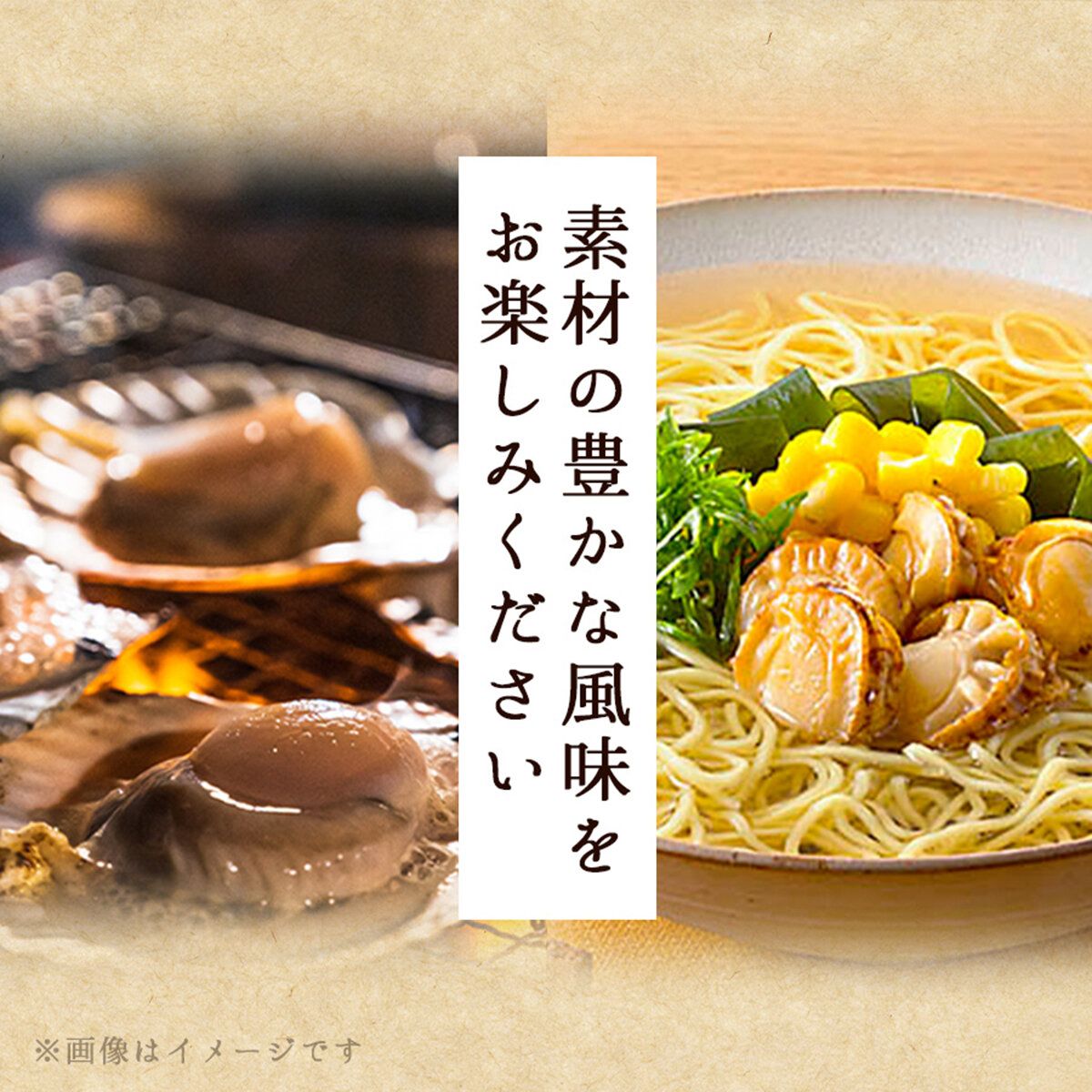 時尚新包裝 食材用料一樣優質 日本製造 北海道產扇貝獨特的鮮味及甜味 使用北海道產小麥粉製造麵條 |