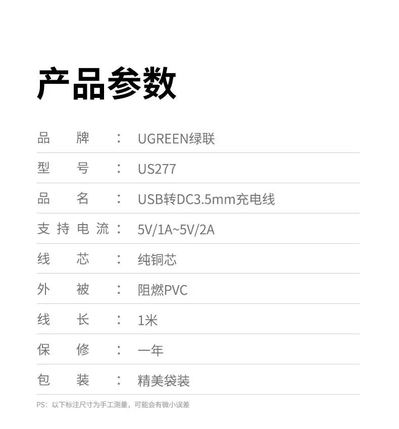 | Description | 绿联圆孔充电线圆头usb转dc3.5mm通用台灯玩具电源数据电牙刷小夜;;颜色分类:1米|黑色 |