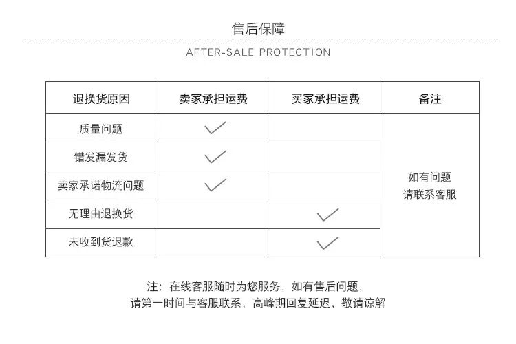 •為了提供優質服務,顧客在收到商品後7天內,如發現商品有問題,可在「訂單記錄」中選擇相關電話號碼聯絡商家處理商品或退回商品(但不退款)。