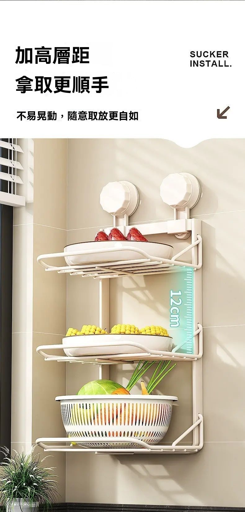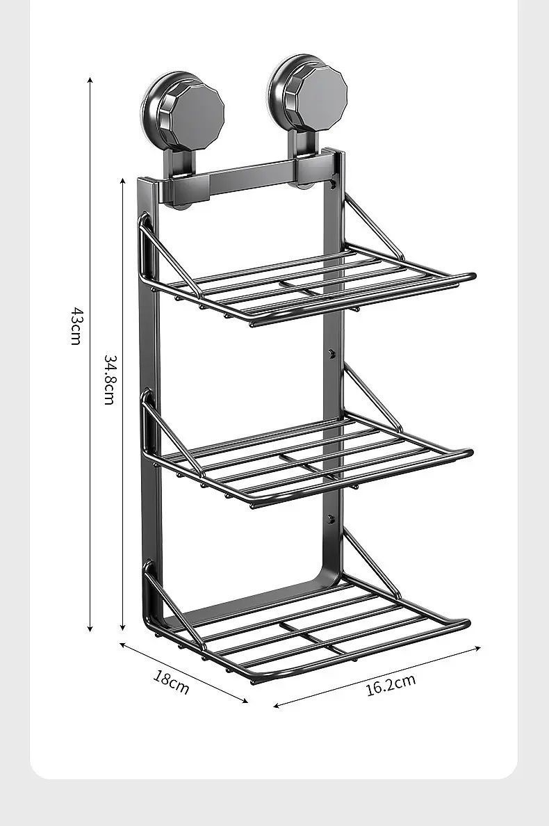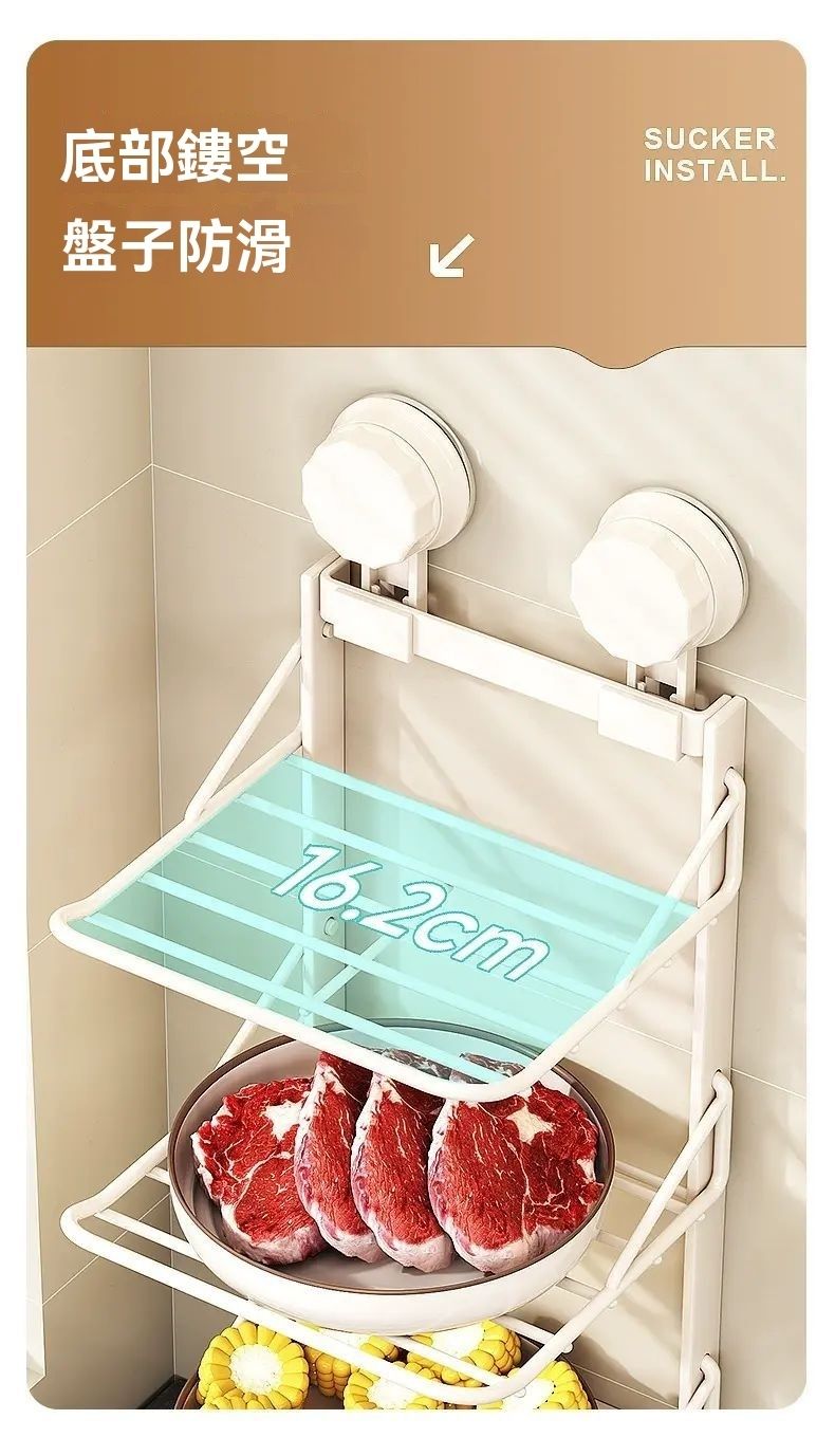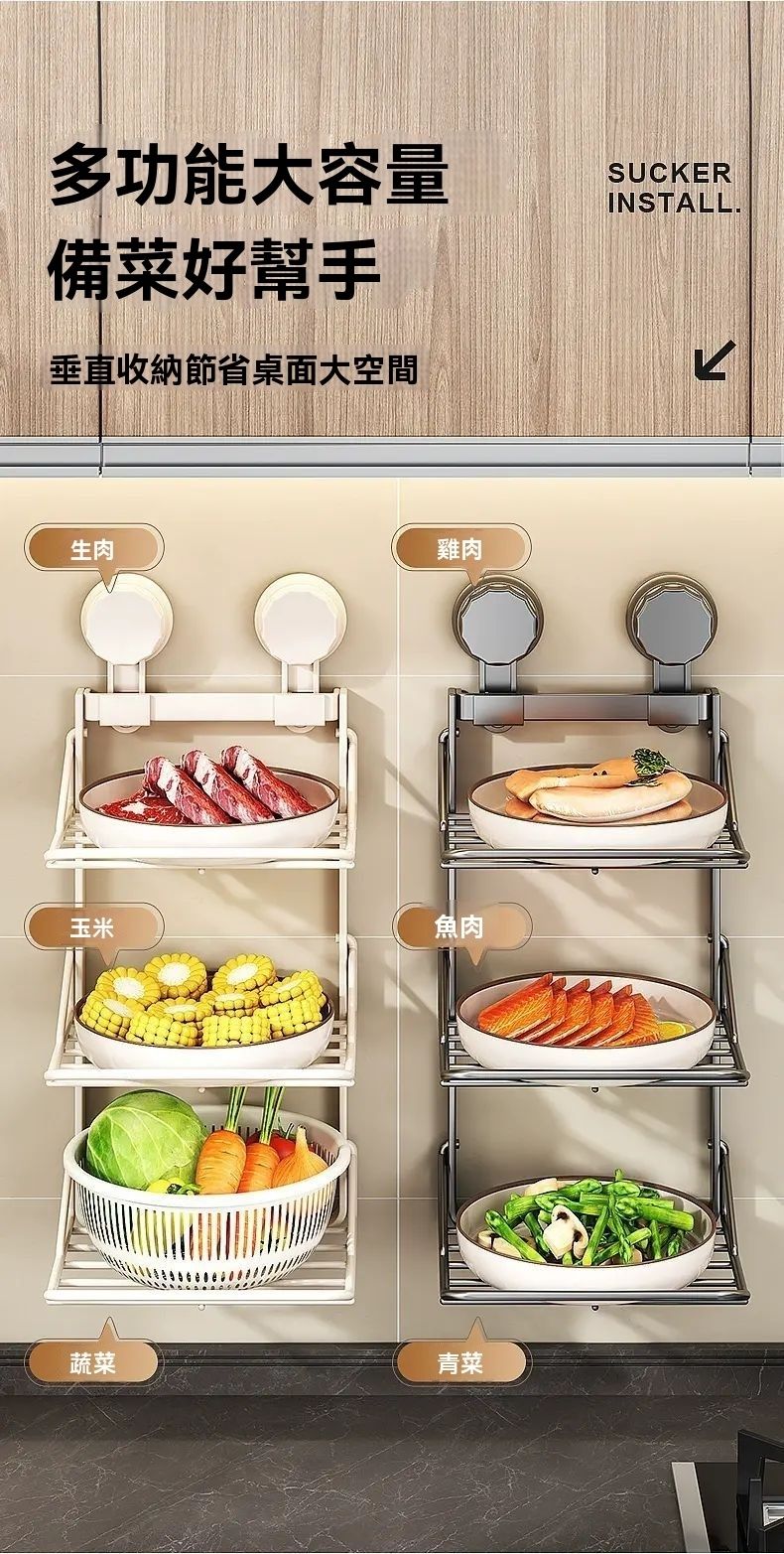 Material: ABS+carbon steel Size: 43*16.2*18cm This kitchen suction cup food preparation rack adopts a multi-layer design and has a large capacity. It can be installed without punching holes, and the suction cup can firmly adhere to the wall without damaging the wall. As a side dish artifact, it can store ingredients in an orderly manner and is easy to take. The wall-mounted design saves countertop space and makes the kitchen tidier.