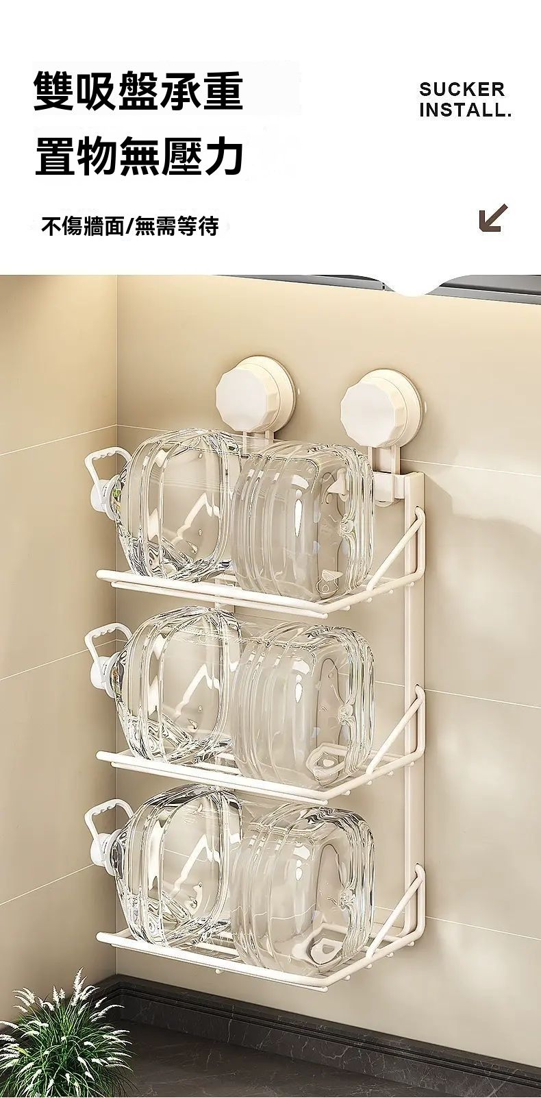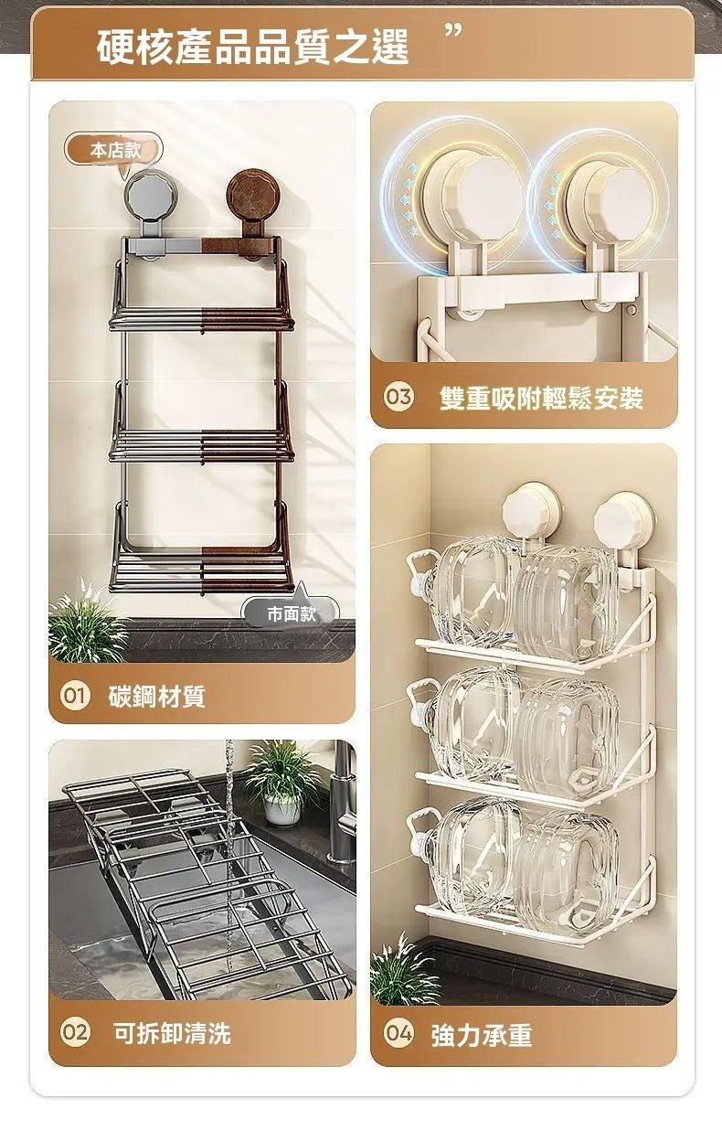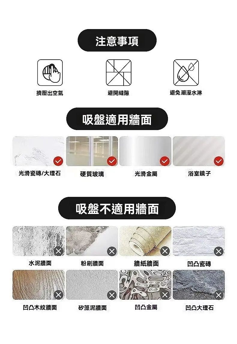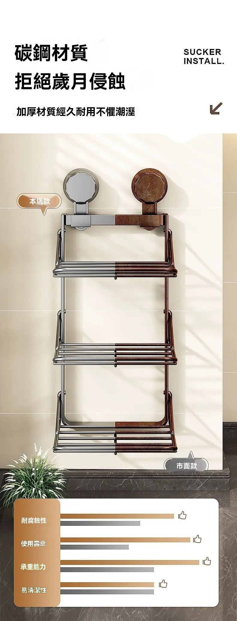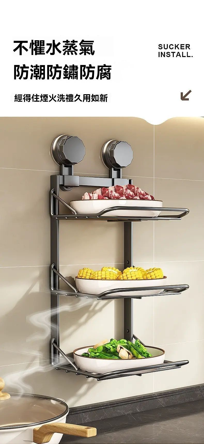 Material: ABS+carbon steel Size: 43*16.2*18cm This kitchen suction cup food preparation rack adopts a multi-layer design and has a large capacity. It can be installed without punching holes, and the suction cup can firmly adhere to the wall without damaging the wall. As a side dish artifact, it can store ingredients in an orderly manner and is easy to take. The wall-mounted design saves countertop space and makes the kitchen tidier.