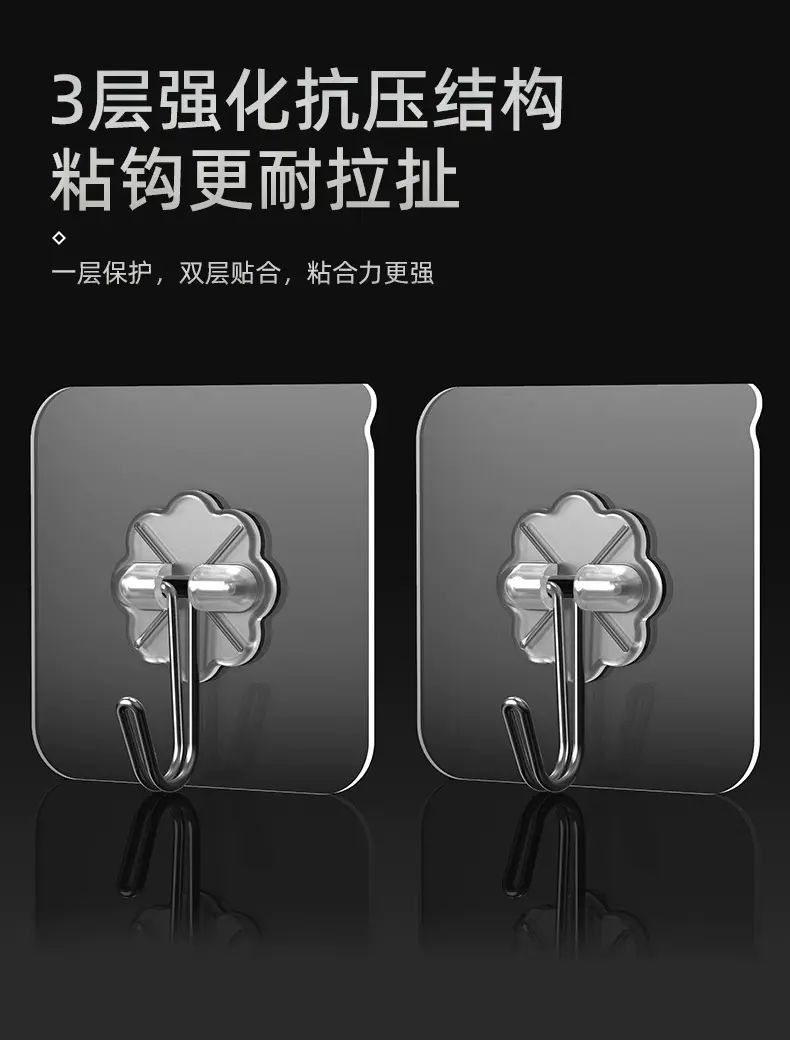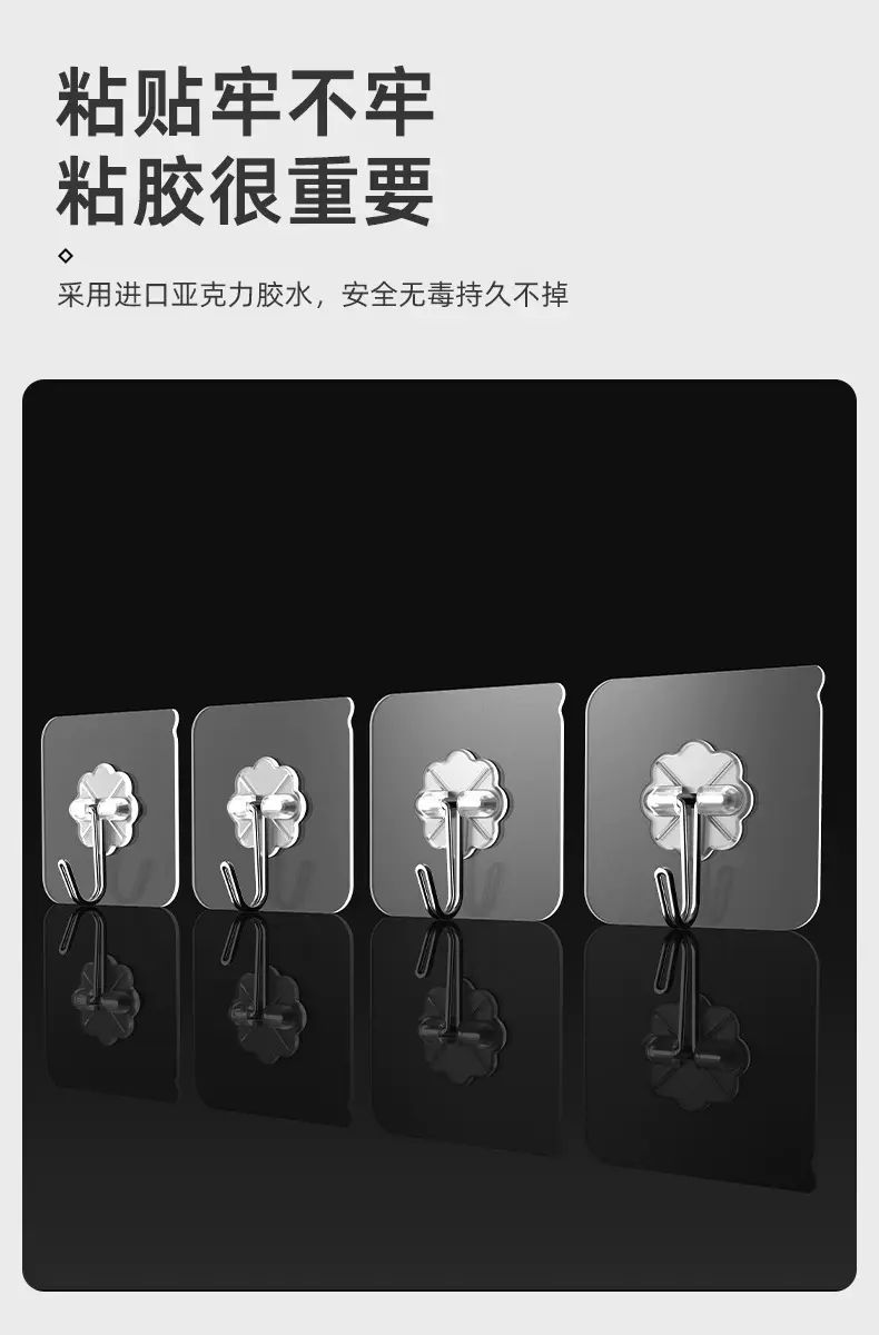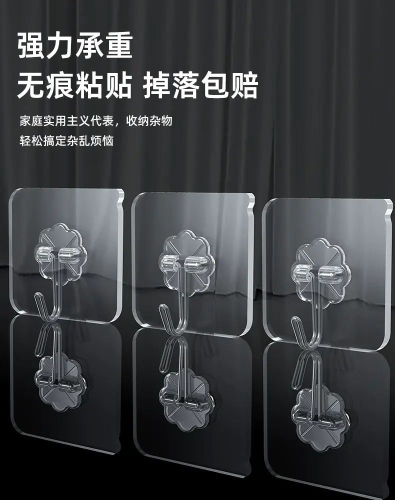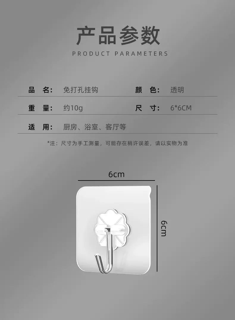 | Description | This transparent, traceless hook is the perfect choice for wall storage! Its punch-free design and strong adhesive make it easy to attach to the wall without damaging it. Its transparent exterior is invisible and beautiful, blending seamlessly with the wall. Its strong load-bearing capacity allows it to securely hold a variety of items. Suitable for kitchens, bathrooms, and bedrooms, it adheres securely and resists falling off, making home storage simple and practical! |