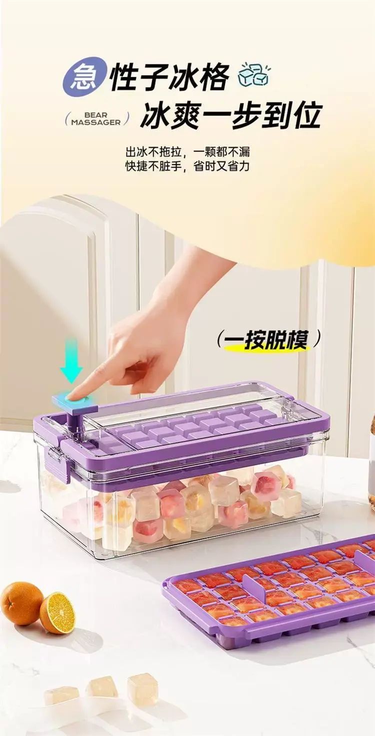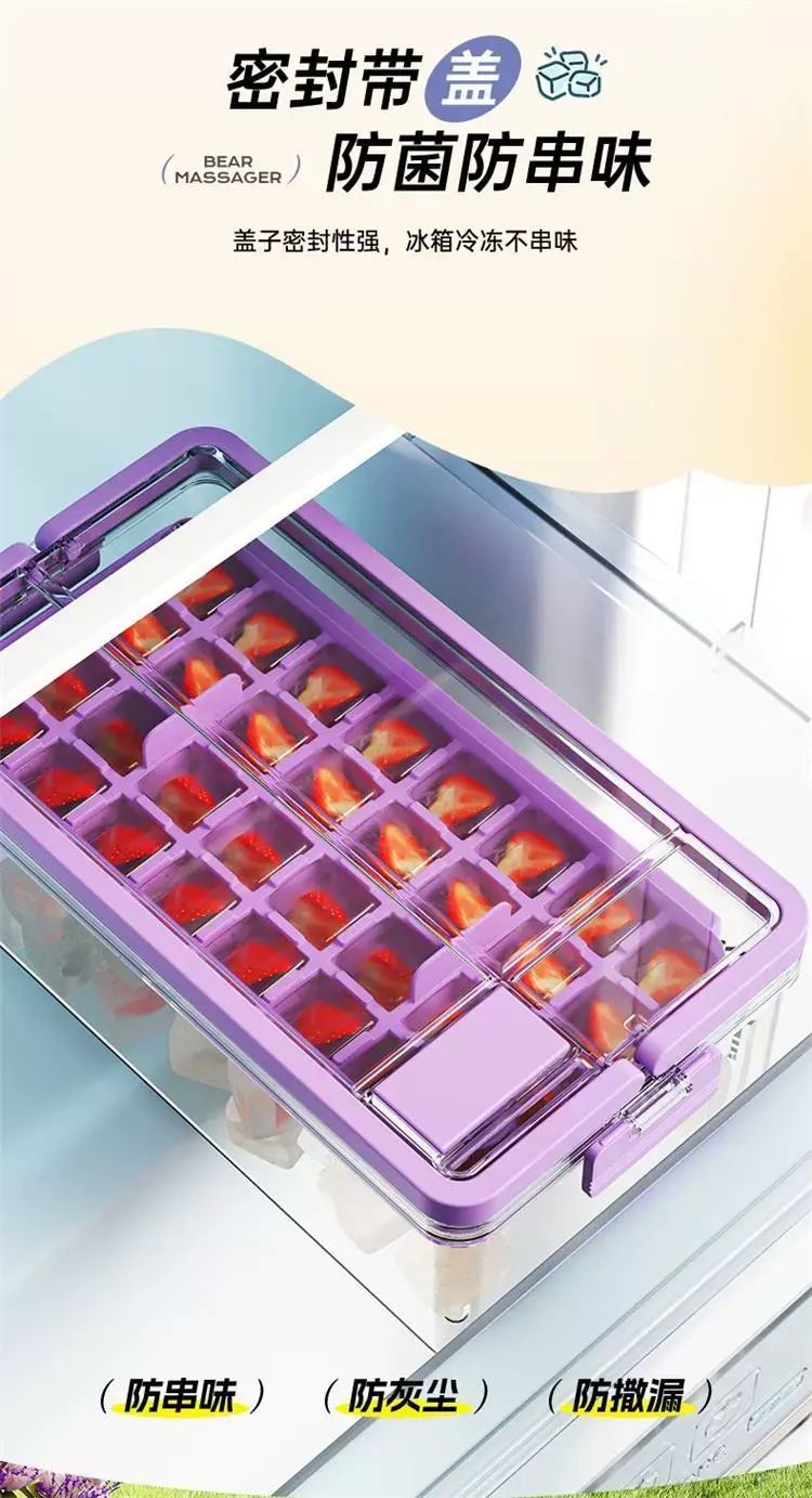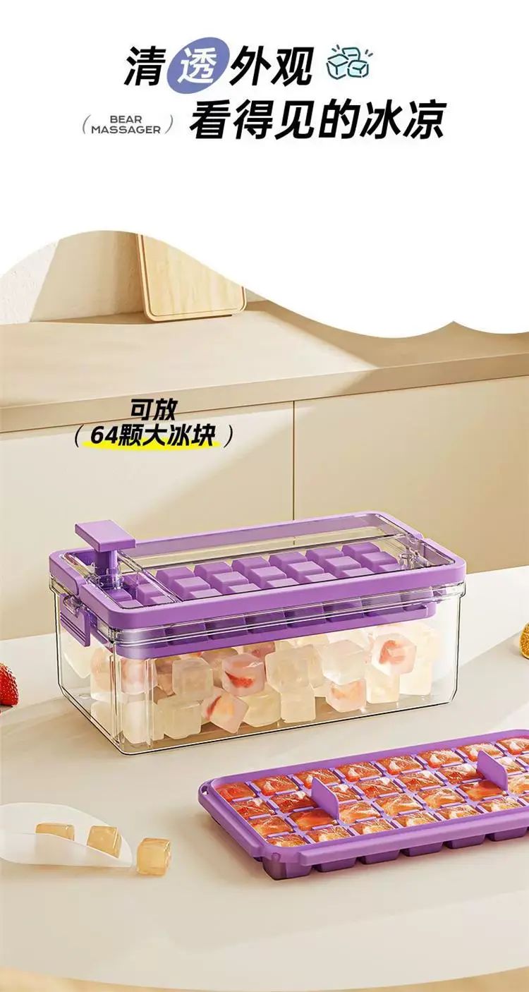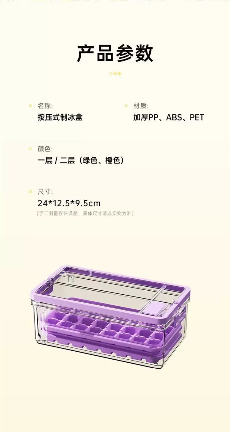 | Description | 冰块模具食品级按压冰格冻冰块盒制冰盒家用自制冰块储存神器;;颜色分类:黛紫-按压冰格(单层66格) |