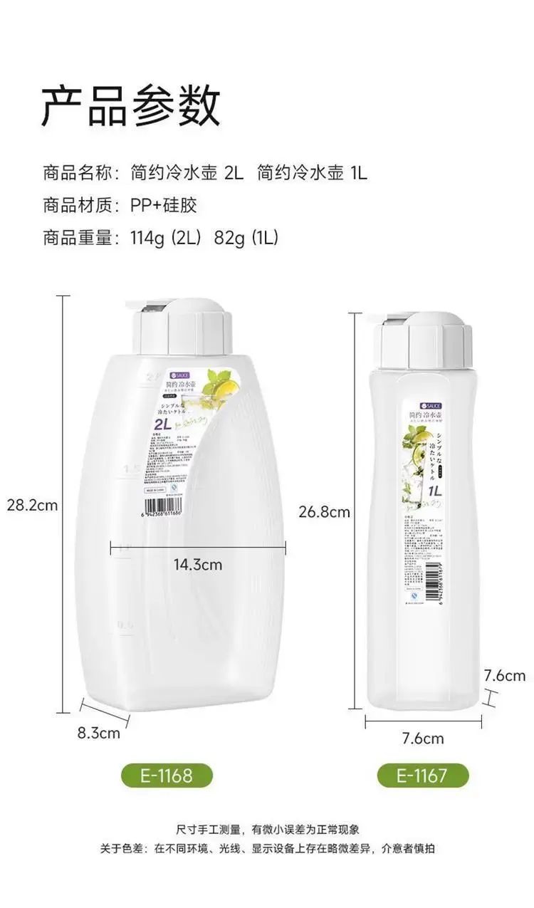 | Description | 冰箱冷水壶家用耐高温凉水大容量水果茶冷泡瓶饮料扎壶食品级新款;;颜色分类:1.0L【食品级PP5材质】 |