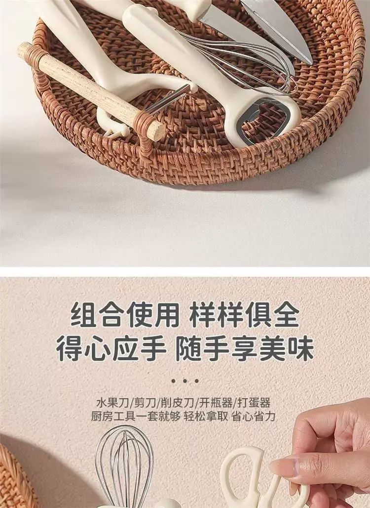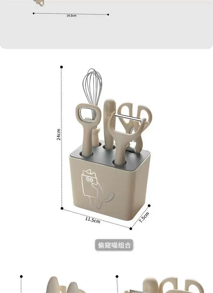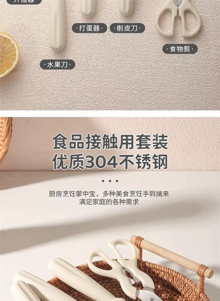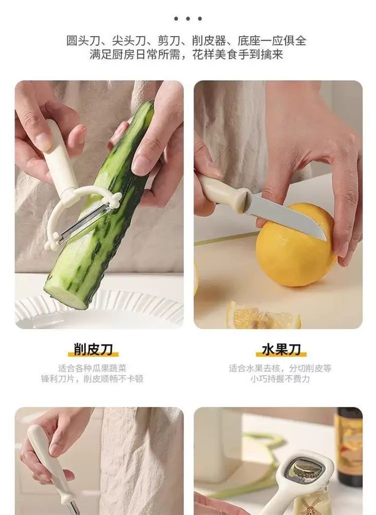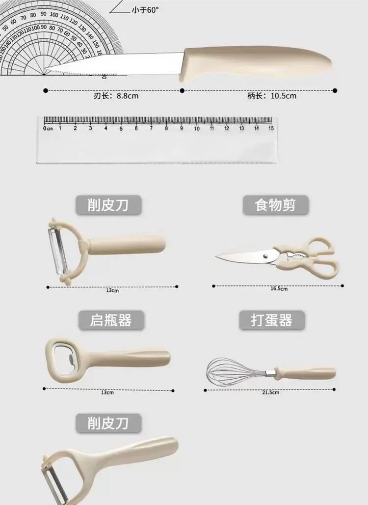 | Description | 厨房小工具6件套组合家用网红厨房剪刀水果刀开瓶器削皮刀套装;;颜色分类:ACA5件-圆头刀尖头刀 |