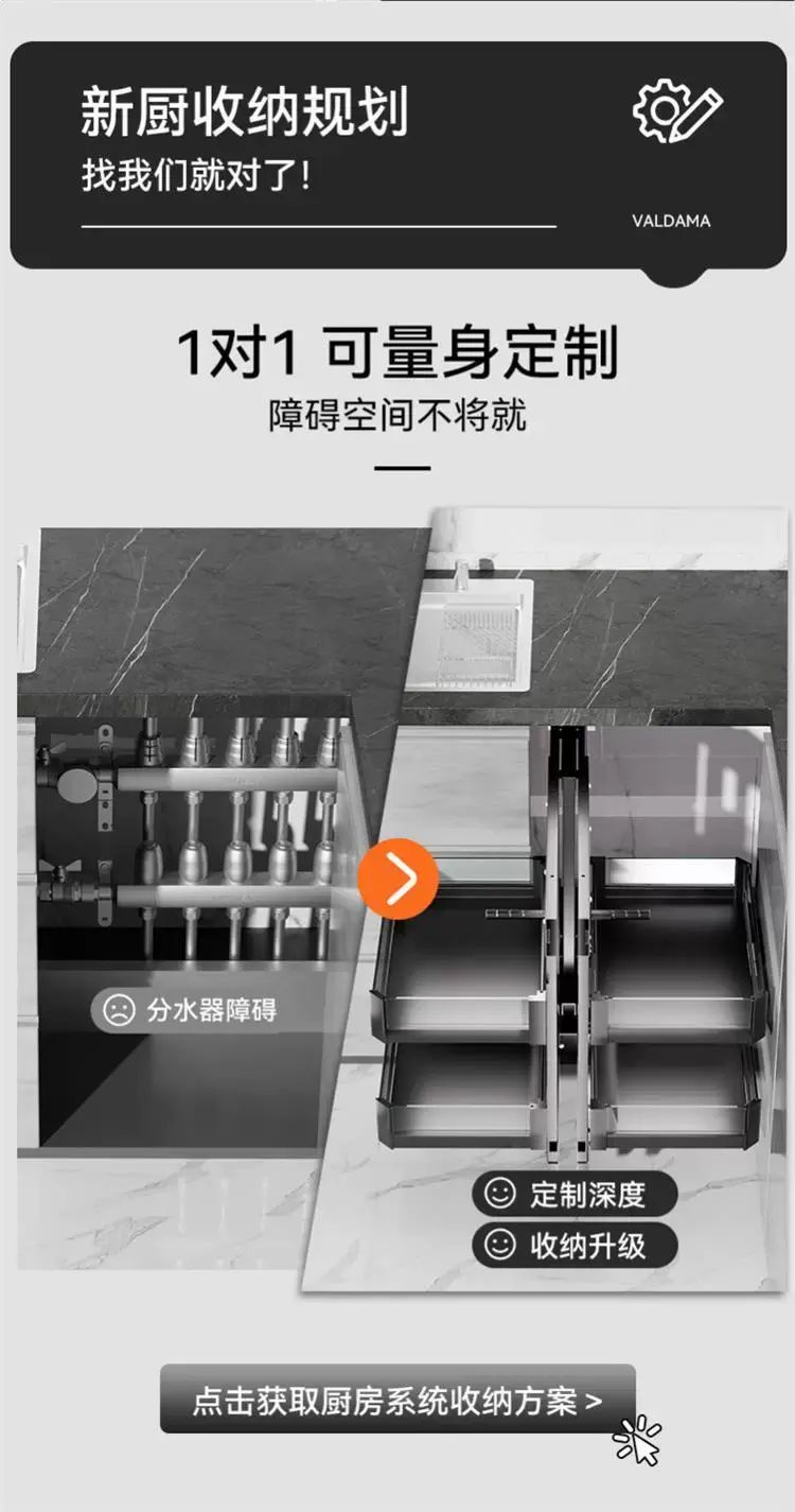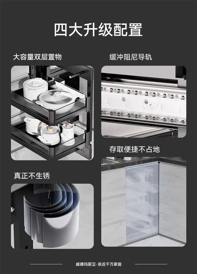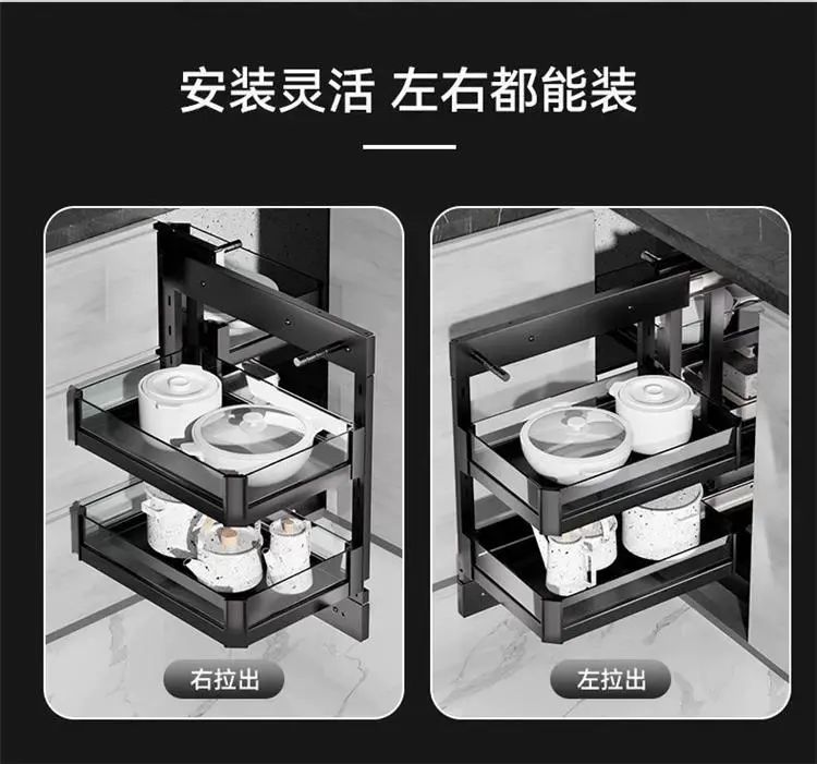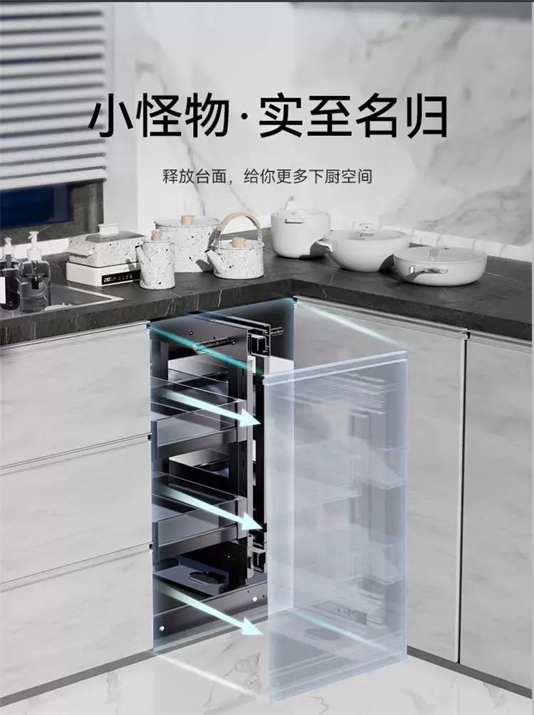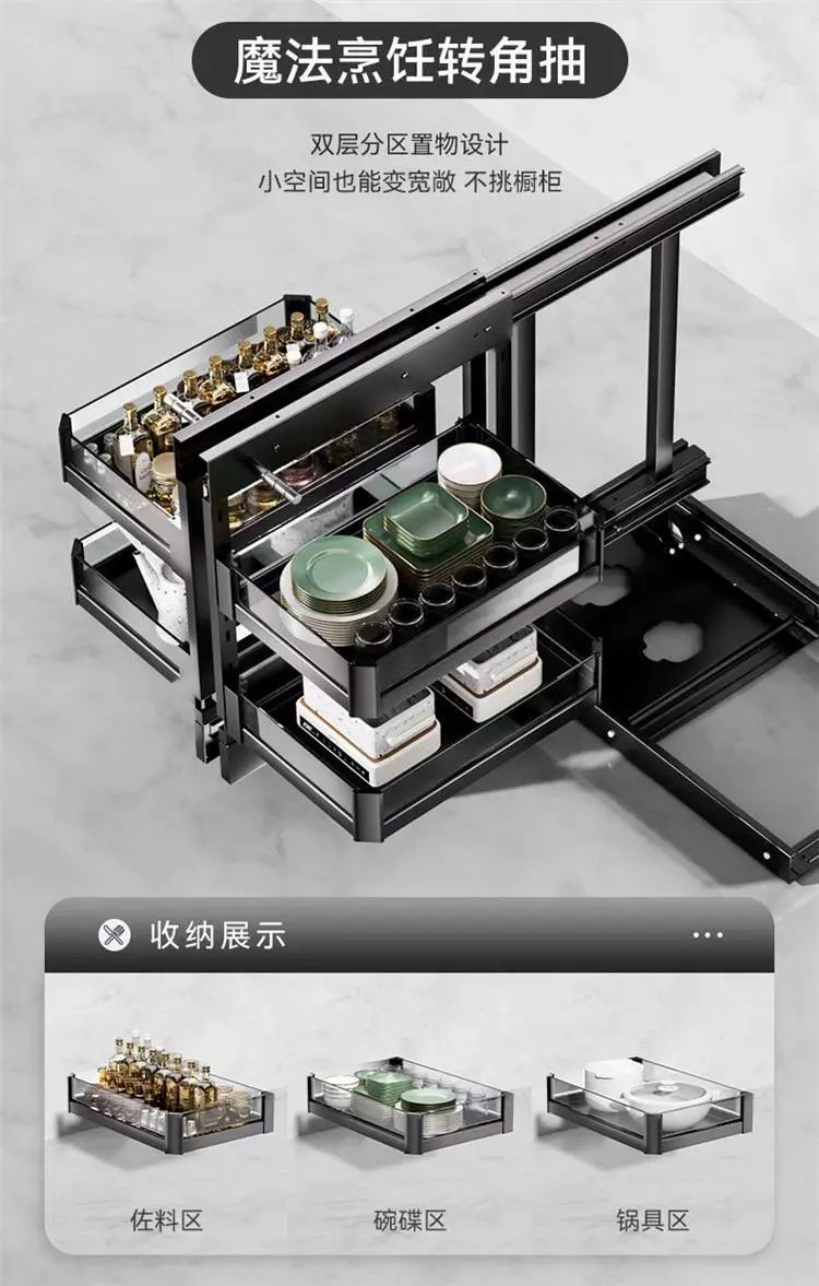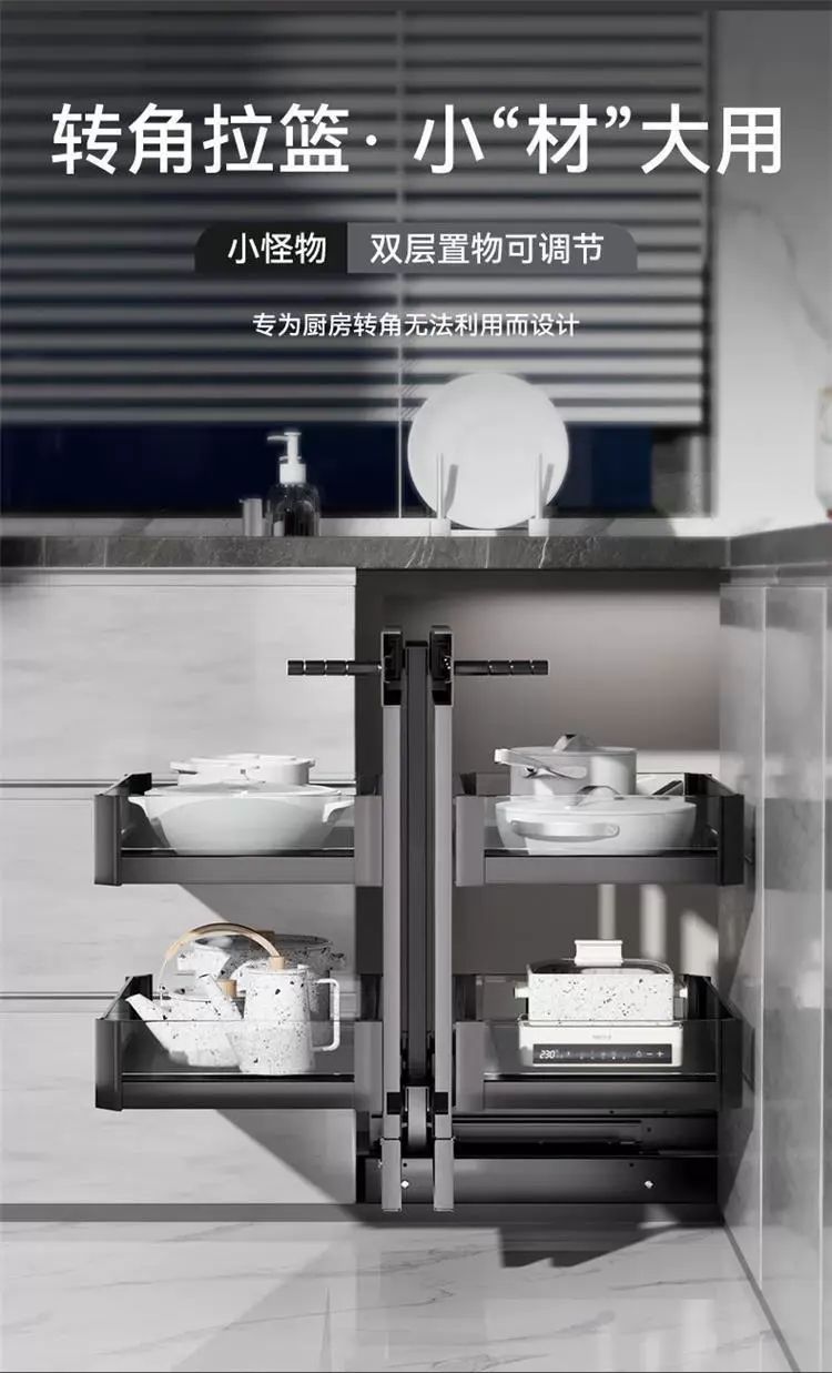 | Description | 厨房橱柜转角拉篮收纳架置物多层旋转太空铝小怪物全拉出联动碗篮;;颜色分类:300柜门全开小怪物【不限左右】 |