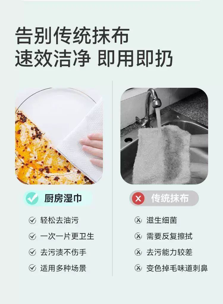 | Description | 厨房湿巾清洁湿巾去油去污家用一次性厨房去油湿巾吸油烟机湿巾纸;;颜色分类:1大包【尝鲜装】 |