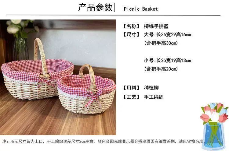 | Description | 柳藤编网红月子花篮野餐篮鸡蛋花篮零食提篮摄影鲜花手提水果篮子;;颜色分类:原木色麻布大号 |