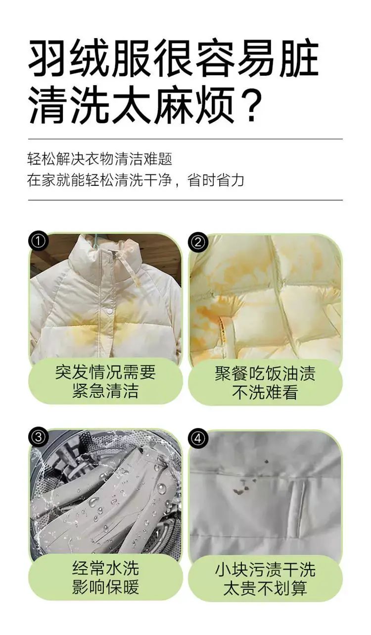 | Description | 羽绒服清洗剂免水洗洗涤剂棉服干洗剂衣服去油污渍家用神器;;件数:标准;颜色分类:1瓶清洗剂(200ml)体验装 |
