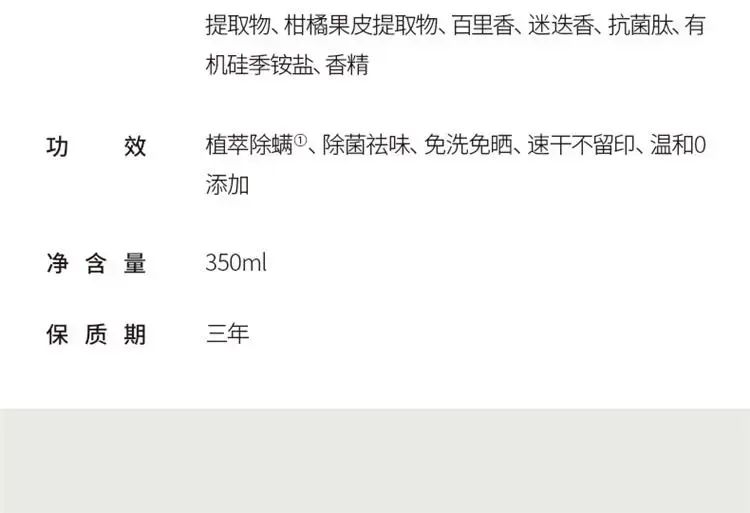 | Description | 3瓶*350ml除螨清新喷雾家用宿舍除螨神器免洗速干祛味抑菌;;颜色分类:【*1瓶装】抗菌肽升级版 |