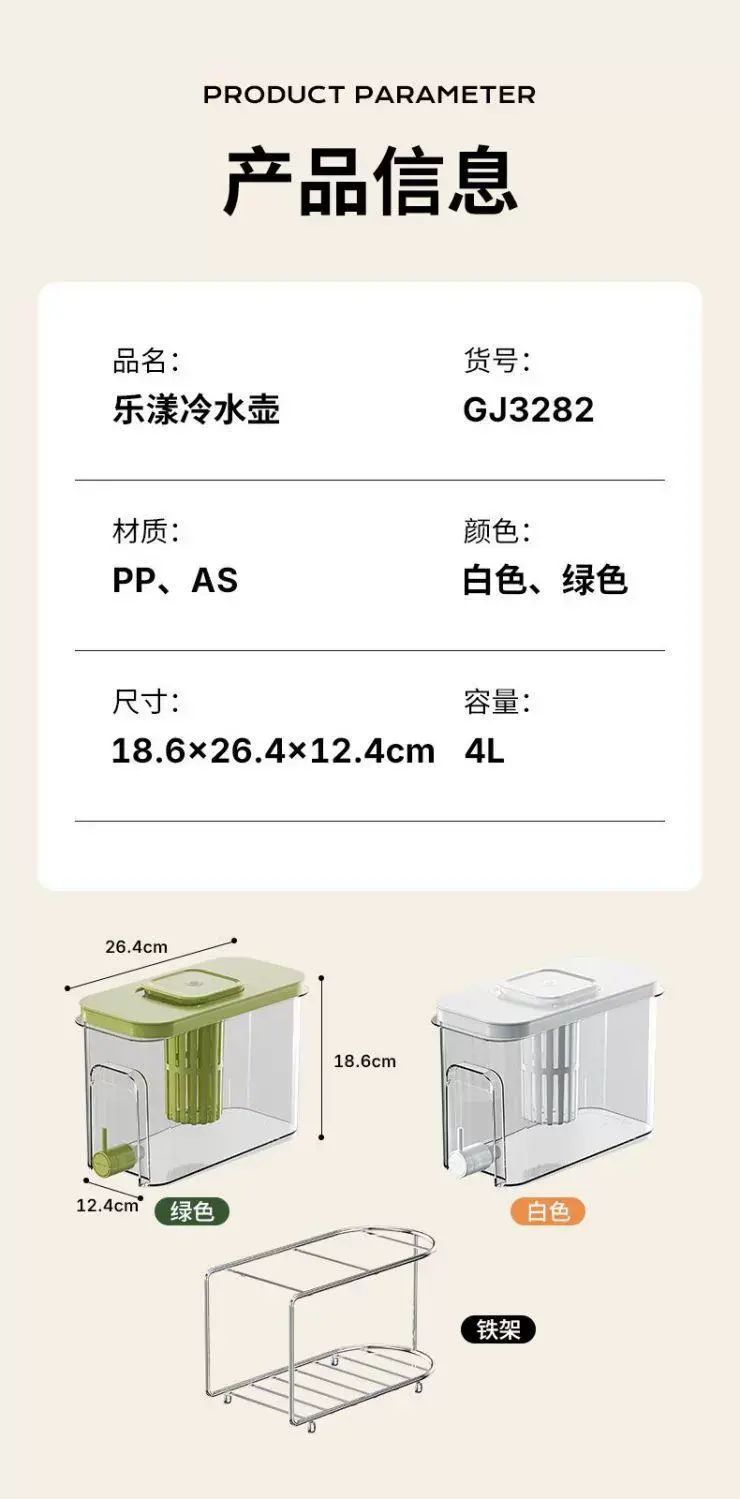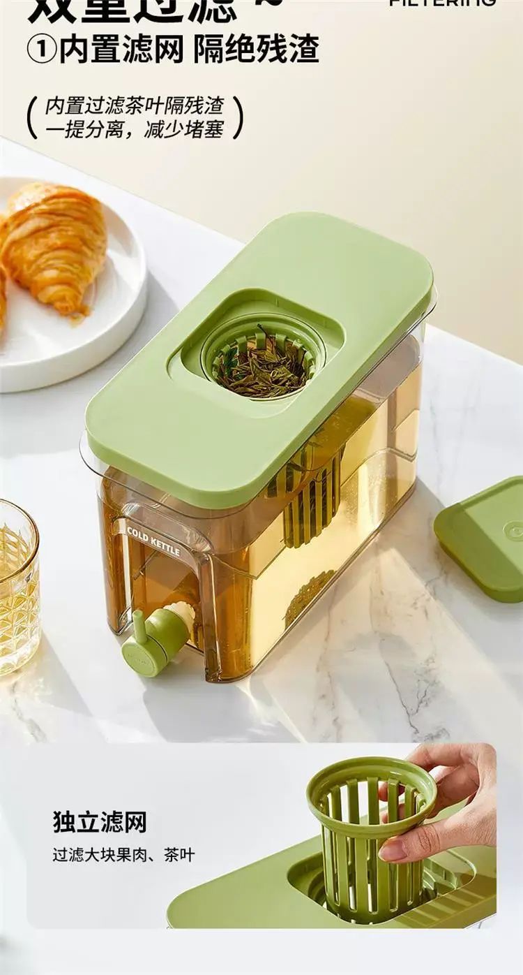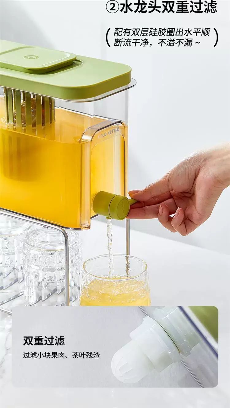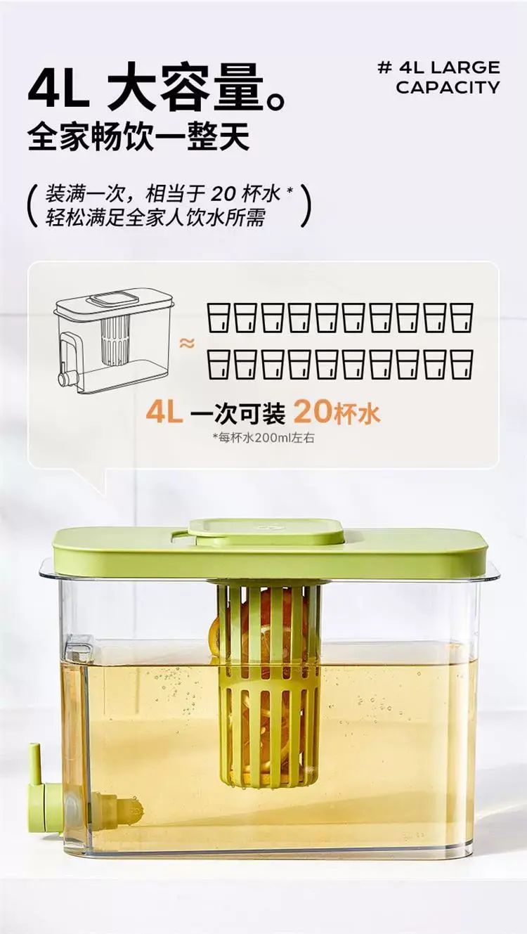 | Description | FaLeClean冰箱冷水壶家用储水冷泡壶饮料桶水果茶桶大容量凉水壶;;颜色分类:升级4L冰箱冷水壶【双重过滤】-绿色 |