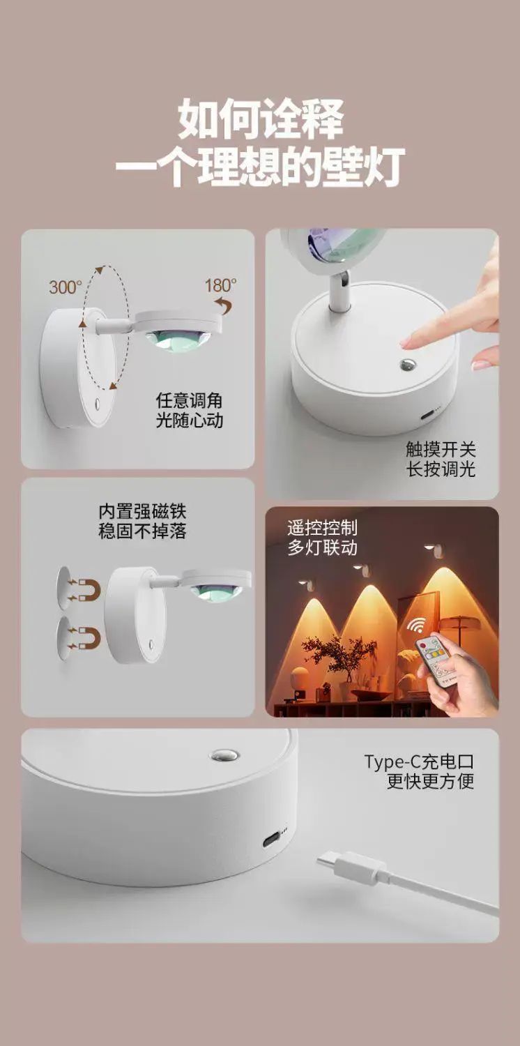 | Description | LED磁吸充电壁灯日不落夕阳灯可移动小夜灯少女礼物氛围灯;;颜色分类:磁吸触摸开关-黑-充电款【日不落光】_1600【1个装】无极调光 |