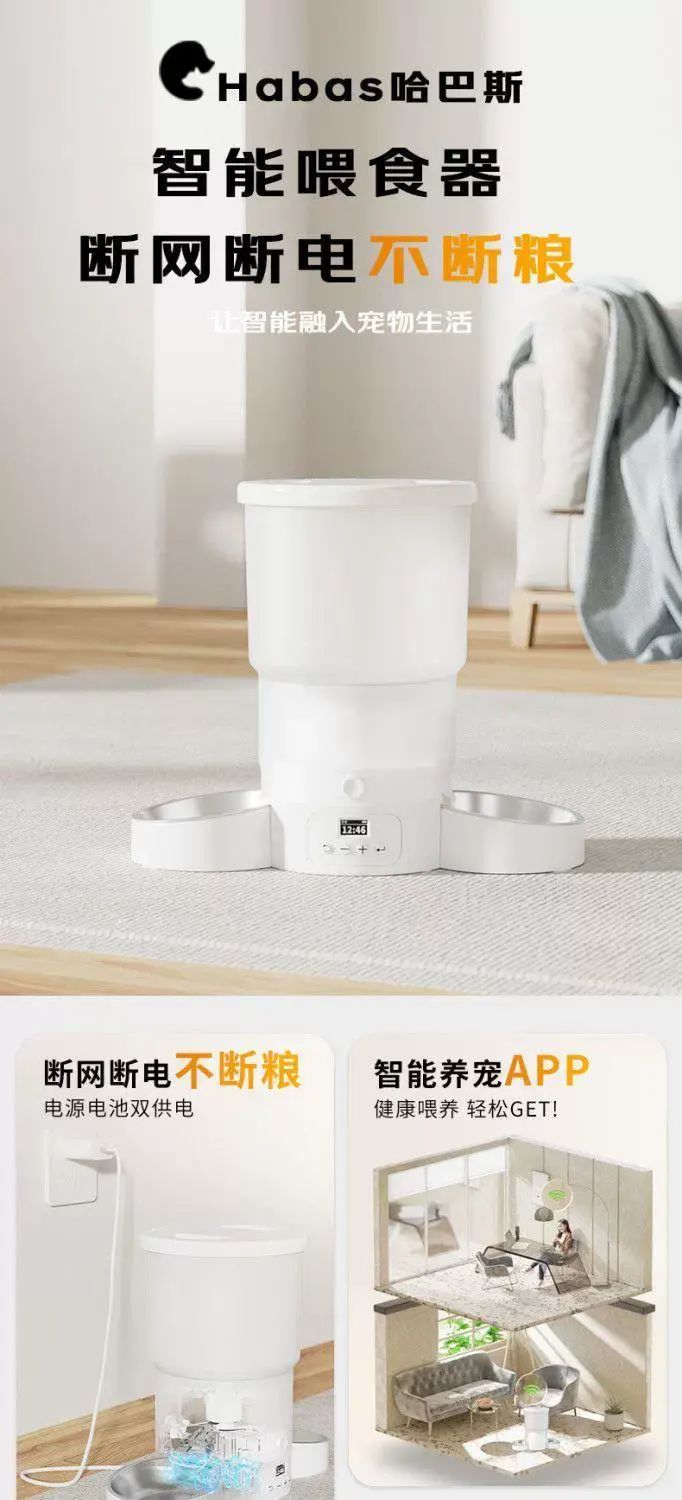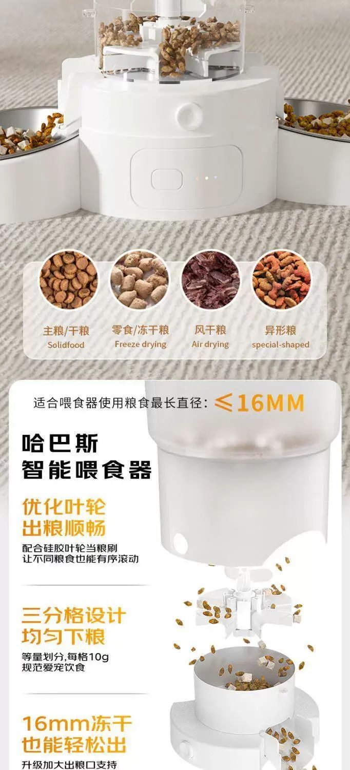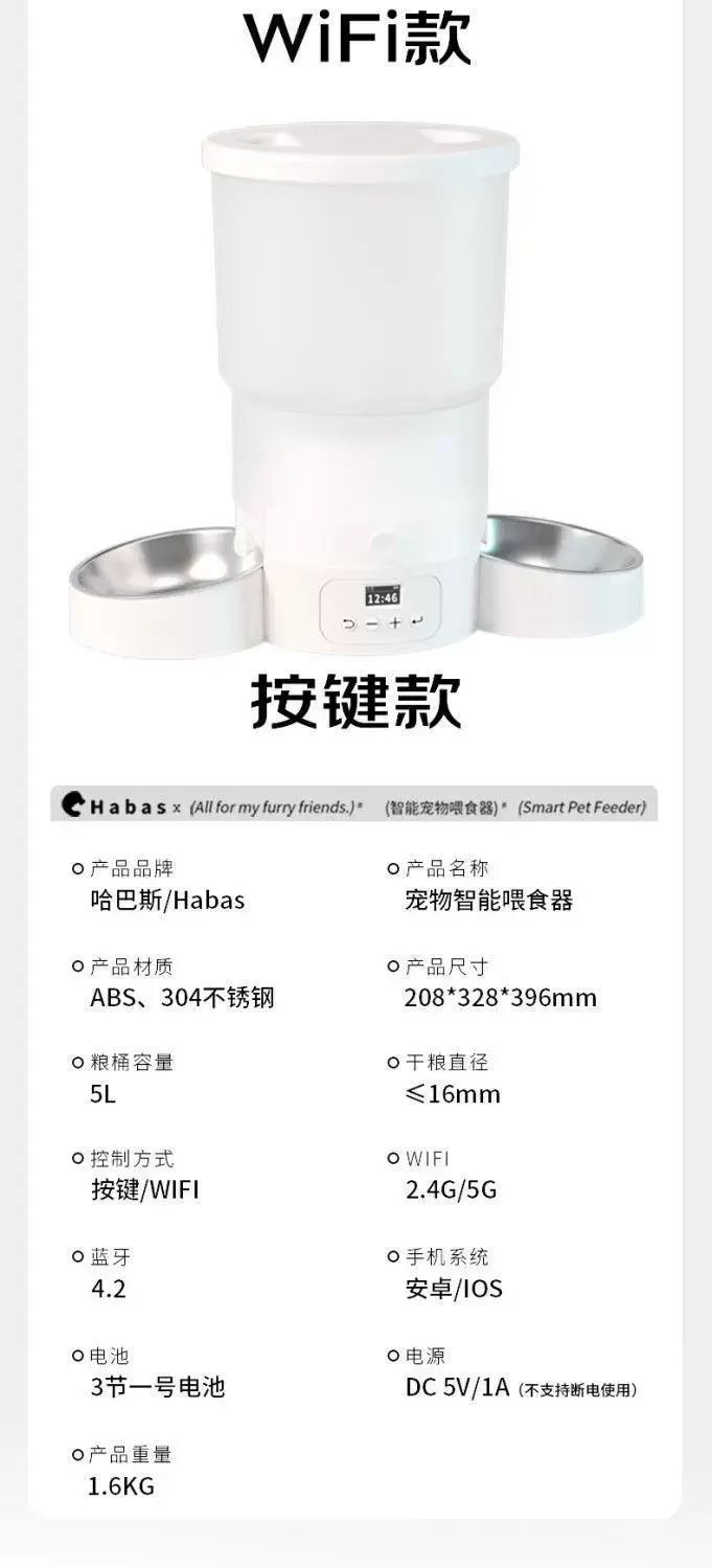 | Description | 哈巴斯定时智能自动喂食器大容量猫咪宠物猫狗粮防潮远程不卡粮;;颜色分类:手机远程喂食-5G +双碗喂食 |