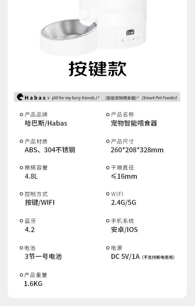 | Description | 哈巴斯宠物智能自动喂食器猫咪定时定量猫咪粮狗wifi投食远程;;颜色分类:【4.8L】无碗-简约版-单喂食器 |