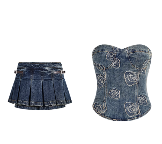 兩件裝牛仔抹胸上衣迷妳裙套裝(藍色)(規格:S-L碼)(下單後聯絡客服確認發貨尺碼)#F047043049