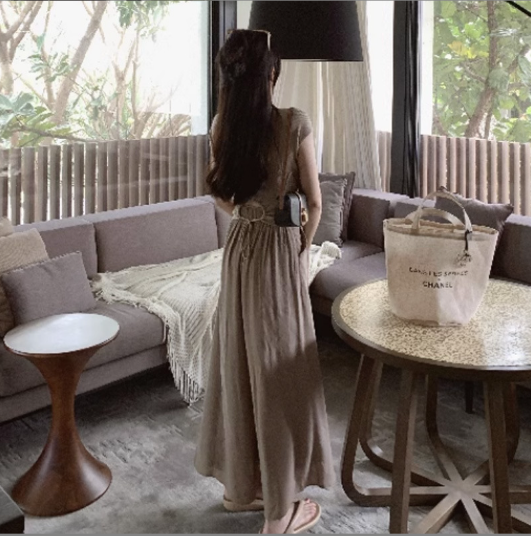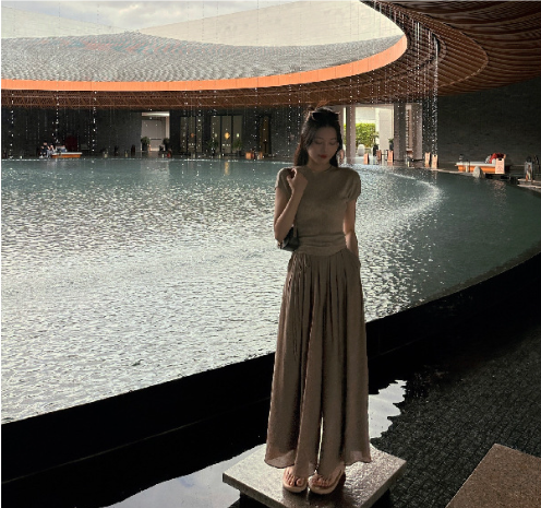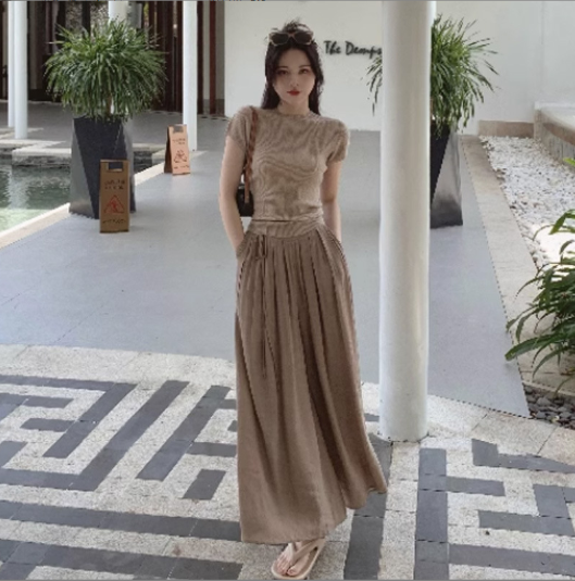 半高領綁帶短袖針織衫棉麻闊腿裙褲套裝(灰色上衣+卡其色裙褲)(規格:S-XL碼)(下單後聯絡客服確認發貨尺碼) #F047050115