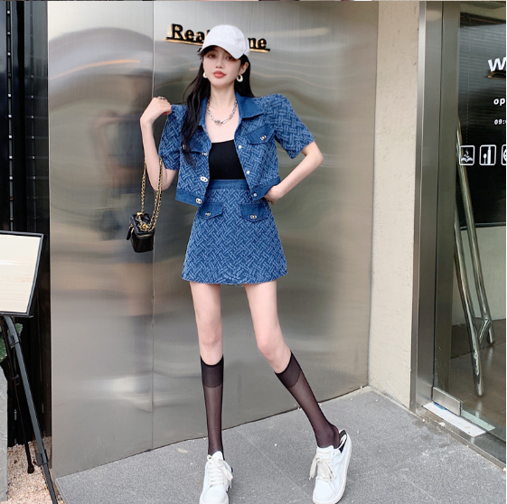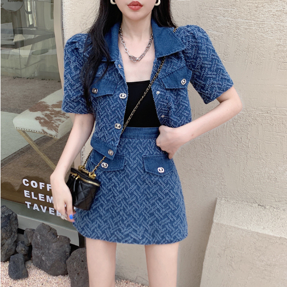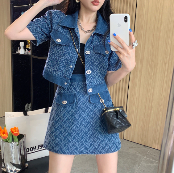 短袖上衣高腰半身裙兩件套(藍色)(規格:S-M碼)(下單後聯絡客服確認發貨尺碼) #F047050080