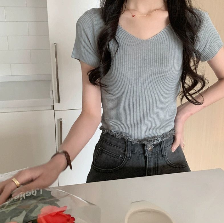V領針織衫百搭修身(灰色 均碼)#F46015256