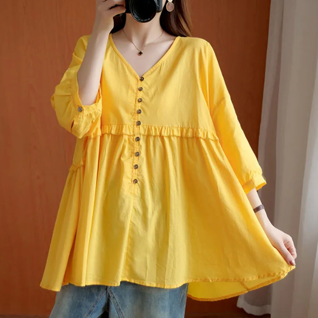 寬鬆荷葉邊V領上衣(黃色L-4XL)(下單後聯絡客服確認發貨尺碼)#F349001330