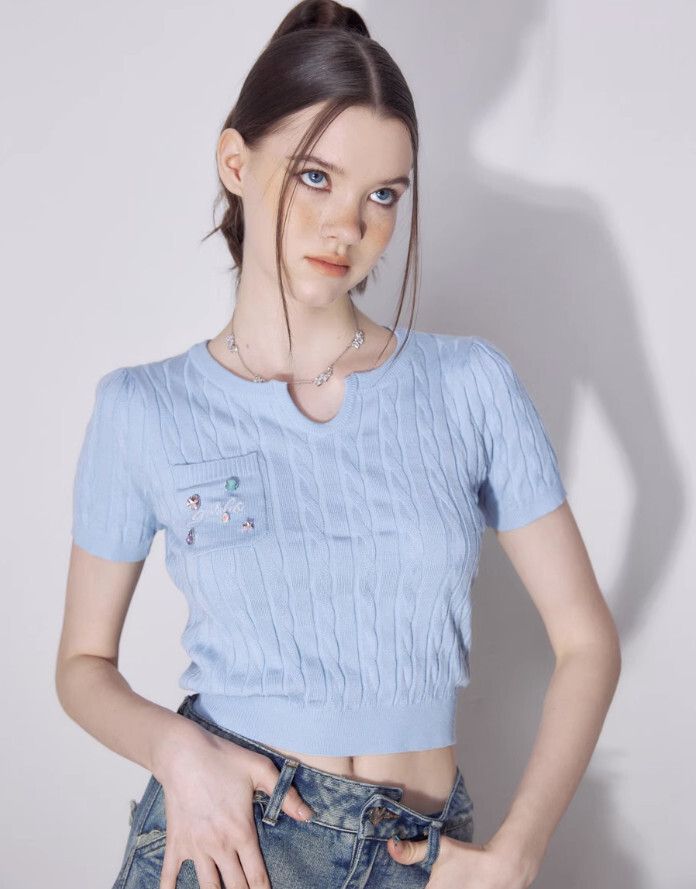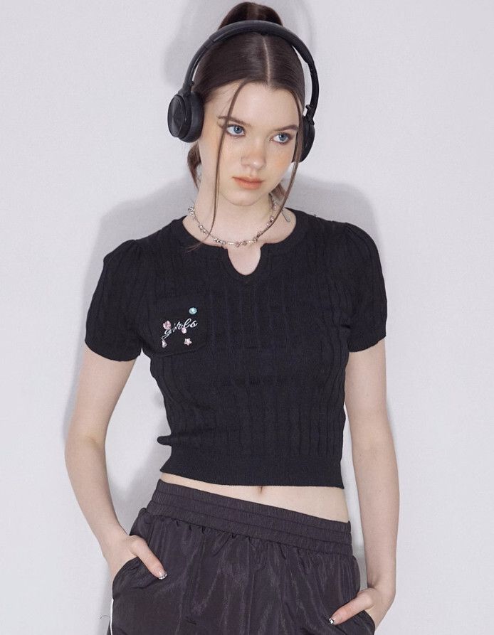 緊身碎鑽針織正肩短袖T卹(杏色)(尺碼:S/M/L)(下單後聯絡客服確認發貨尺碼)#F002072005