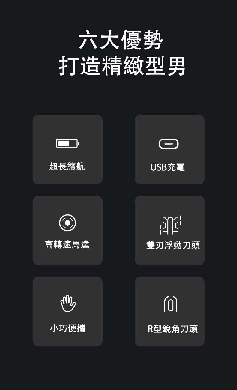 1. Super long battery life 2.USB charging 3. High speed motor 4. Double-edged floating blade 5. Small and portable 6. R type acute angle cutter head |