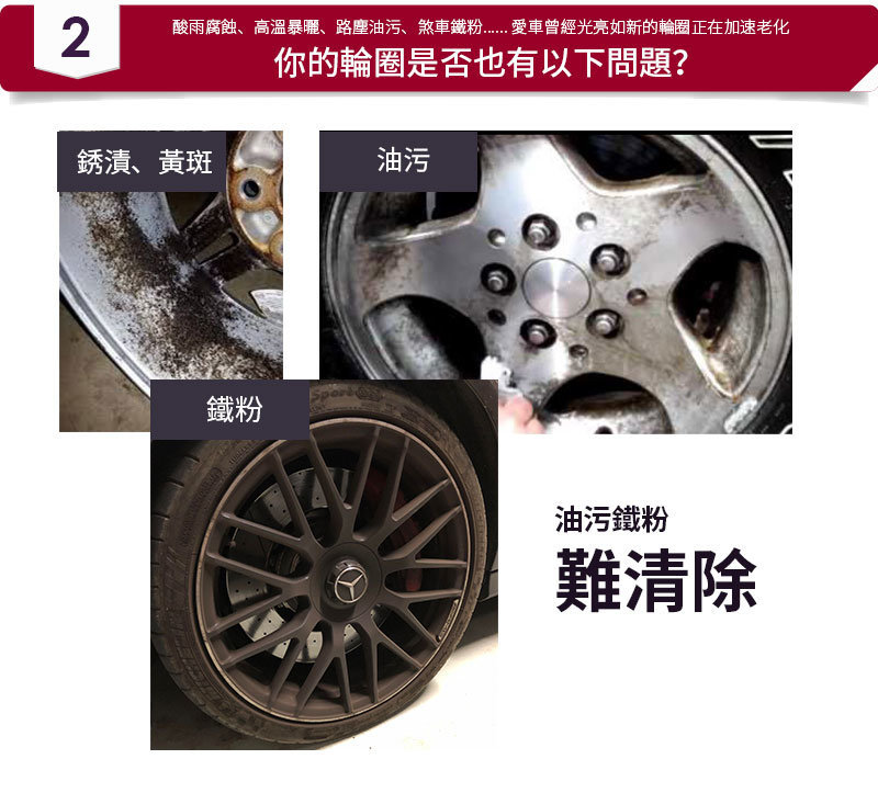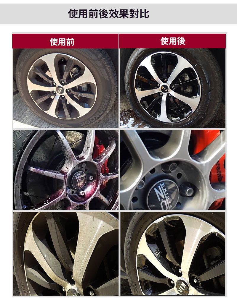 ✅方便、省時、省力,只需一噴一沖即可輕鬆去除輪圈上的頑固污漬,回復亮麗光澤