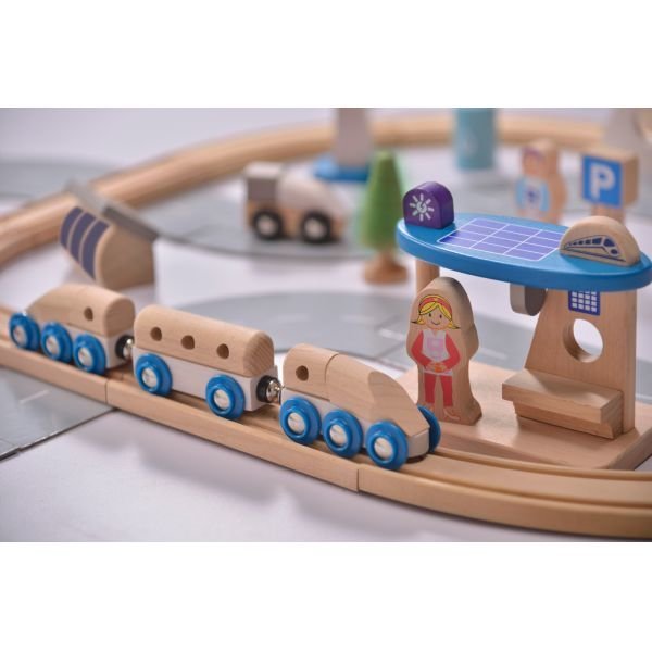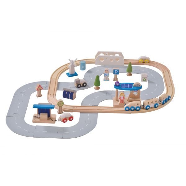 Eco City Train Set Age : 36m+ Size : 76 x 10 x 72cm Materials : Wooden |