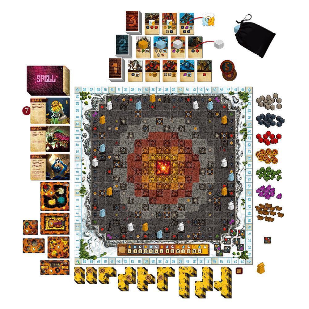 Working on the same game board with the other players (but beginning at your own entrance), you'll dig a competing network of tunnels by spending increasingly valuable materials to lay polyomino tiles onto the map. You want to extend your tunnels to connect with buried gold and materials, with workshop locations that can transform resources, and especially with toppled statues. Statues are key to scoring, and you'll spend carts to move them through the tunnels to prime scoring locations near the heart of the mountain.