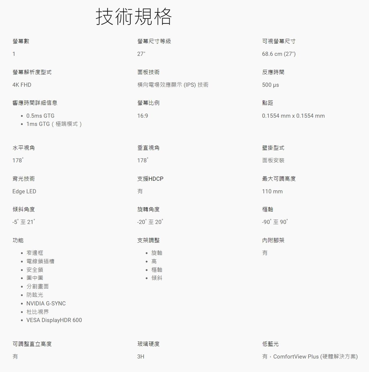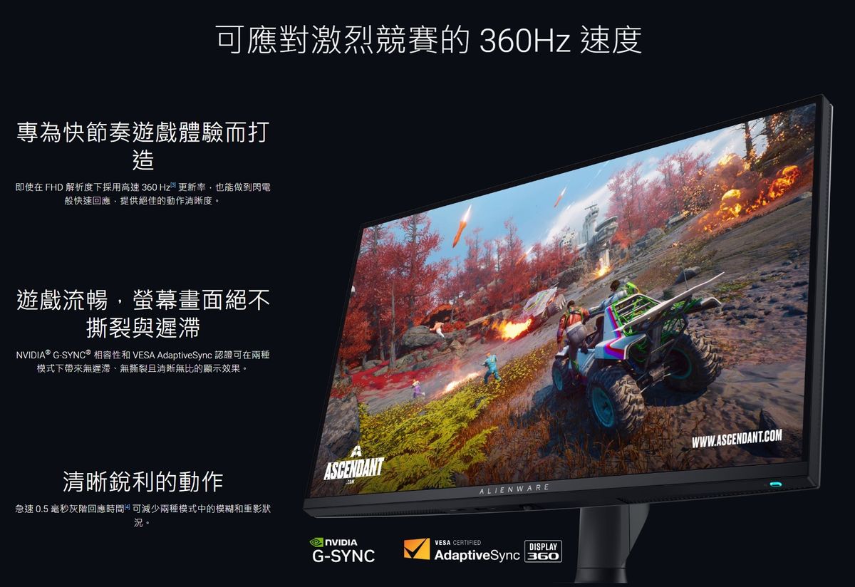 Alienware 27 4K Dual-Resolution Gaming Monitor - AW2725QFColor gamut reaches 95% DCI-P3 Native contrast ratio 1000:1 Brightness: 400cd/m2 (normal), 600 cd/m2 (HDR peak) 3840 x 2160, up to 180 Hz (4K mode) (overclocked to 170 Hz/175 Hz/180 Hz) 1920 x 1080, up to 360 Hz (FHD mode) (overclocked to 340 Hz/350 Hz/360 Hz) Connection : 2x HDMI 2.1 1x DisplayPort 1.4 |