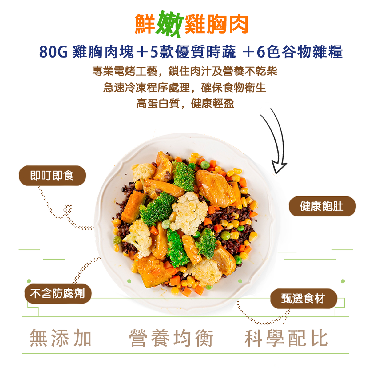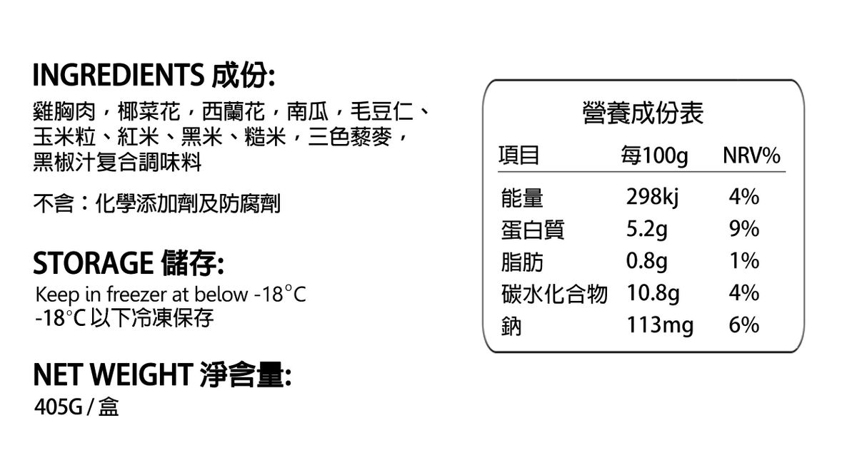 Chicken Beast + Vegetables Brown Rice Ready-to-eat Black Pepper Favor (405g) Higher dietary fiber than ordinary rice 6 different type of vegetables + 6 colored brown rice Free of any harmful fertilizers to keep you healthy and happy Special production process, clean and eat safe !! Ready-to-eat IQF quick-frozen technology is used to preserve the original taste, flavor and nutrition of the products Best Before : 1 May, 2026