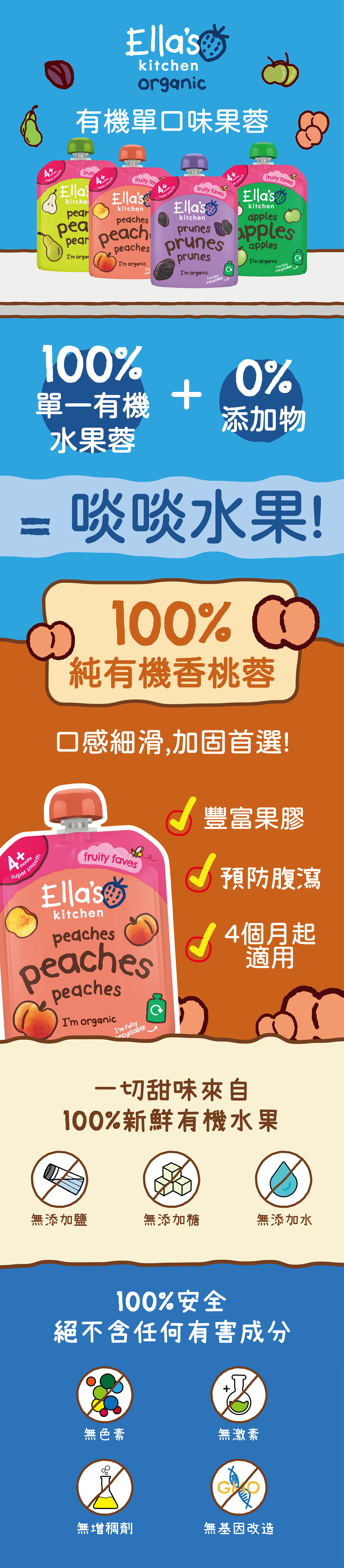 Ella’s kitchen所有產品的配方,均由英國兒科專家及資深營養師用心鑽研,確保營養豐富平衡,切合嬰幼兒成長所需。產品一概不添加防腐劑、色素、糖、鹽、水和增稠劑,讓寶寶嘗到的每一口都是天然、純淨、新鮮的食材味道。