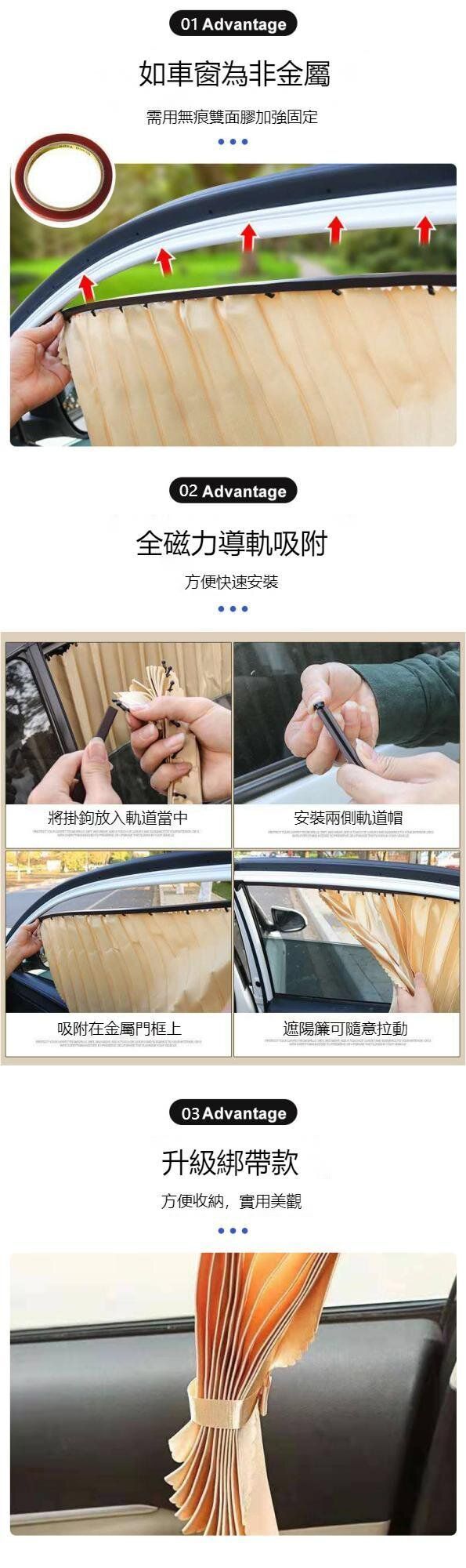 Magnetic curtains are connected to the rails, and the installation is convenient and quick: put the hooks into the curtain rails, install the rail caps on both sides, and attach them to the metal door frame, and the sunshade can be pulled at will. |