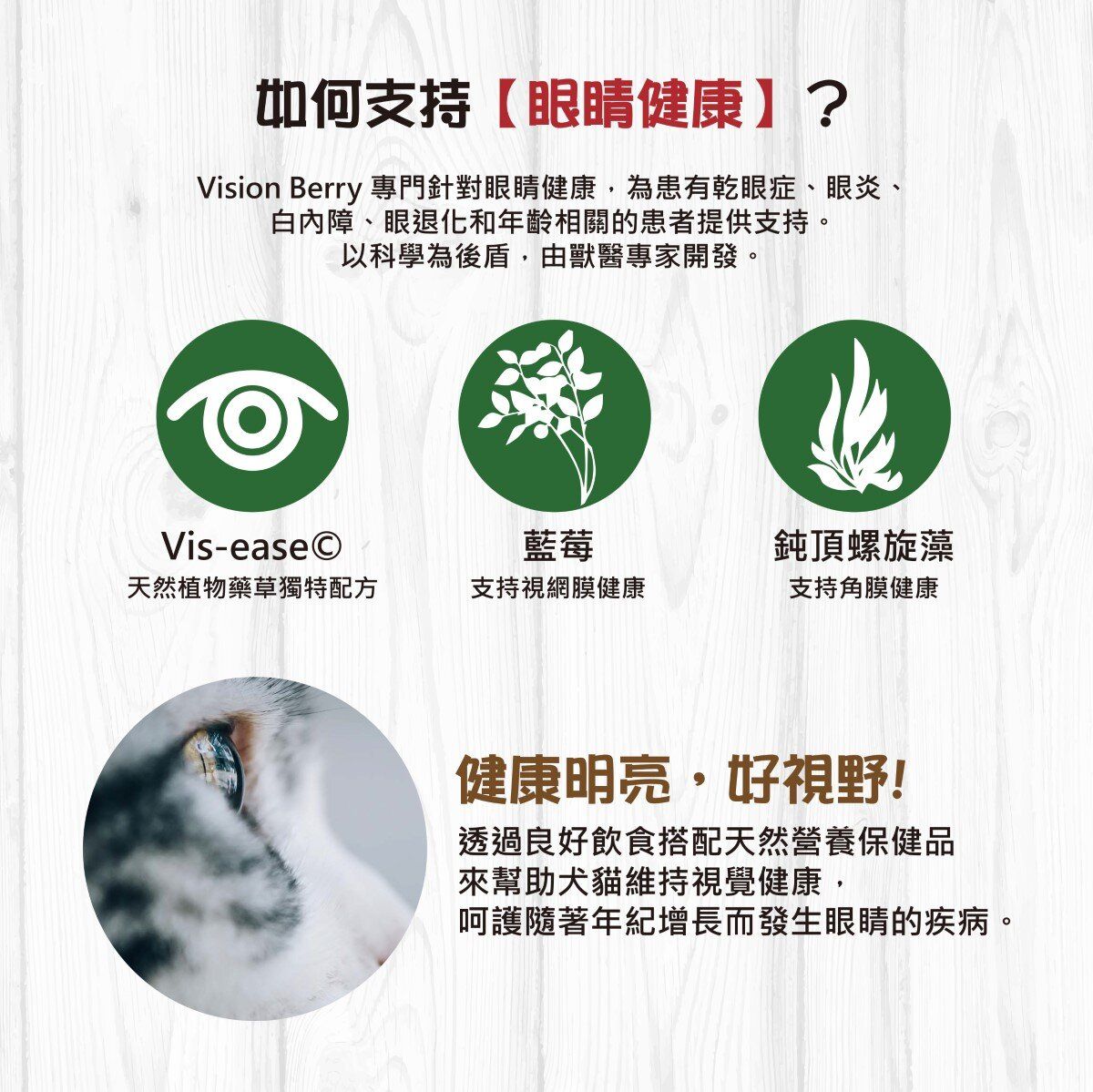 從6個月大開始的用於狗和貓,幼犬和小貓的視覺漿果膠囊是一種營養補品,可支持健康的眼睛和視力。 成份: 漿果專用混合藍莓(Cyanococcus) 螺旋藻(Spirulina Plantensis) Vis-ease(天然植物的植物化學混合物的獨特組合) 220mg 釀酒酵母 130毫克 姜藥材 (生薑)10毫克 薑黃根(Cucuma Longa)60毫克 牛磺酸 30mg 蔬菜纖維素膠囊 100毫克 添加劑: 技術添加劑:麥芽糊精(玉米) Vision Berry-專門針對眼睛健康而設計,可為患有乾眼症,發炎性眼病,白內障,變性眼病和與年齡有關的患者提供支持。 由科學支持並由獸醫專家開發。 藍莓(藍藻)-支持健康的視力,尤其是視網膜。 螺旋藻(螺旋藻-包含維持角膜健康和天然的Omega 3脂肪酸來源的多醣。 CC藥證書-包含高水平的B族維生素和B葡聚醣,對腸道和整體動物健康有有利影響。天然益生菌。 薑黃素-減輕眼睛壓力並保持健康的視力。在乾眼條件下提供抗炎和抗過敏作用。 牛磺酸-視網膜中最豐富的氨基酸。支持健康的視神經功能。 津吉伯(姜)-預防糖尿病引起的白內障。 |