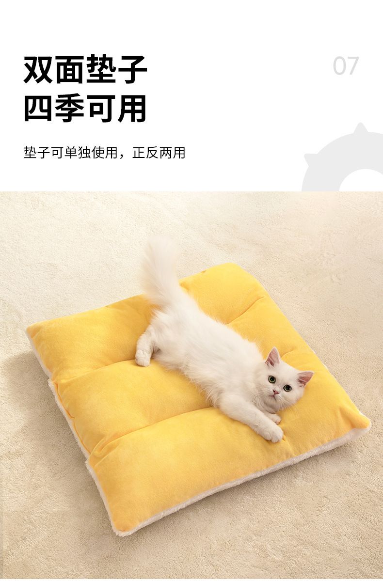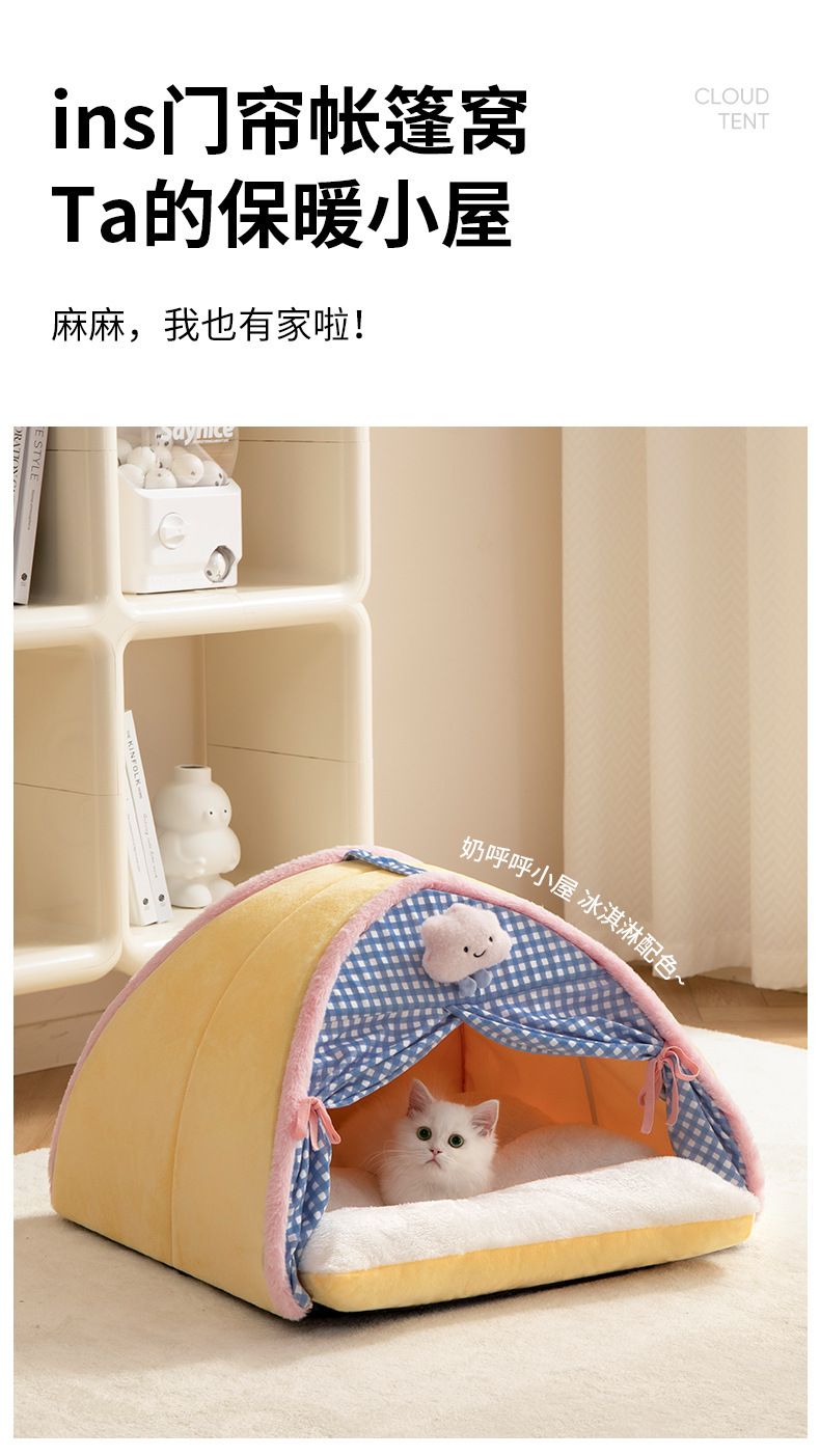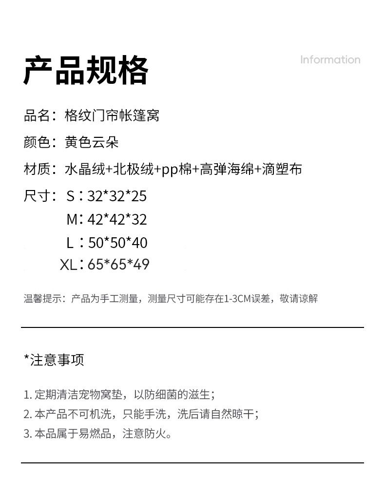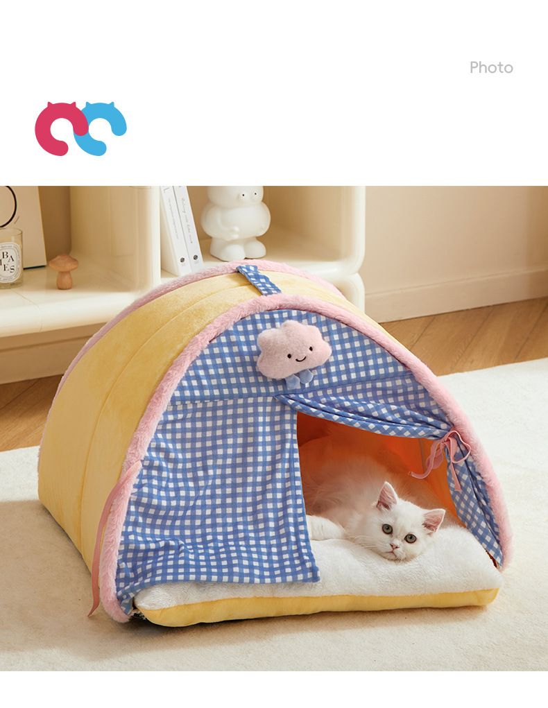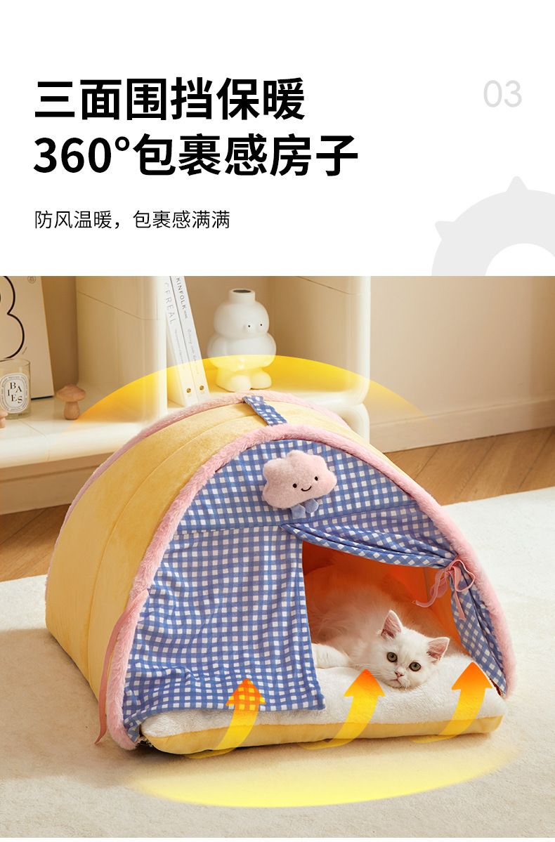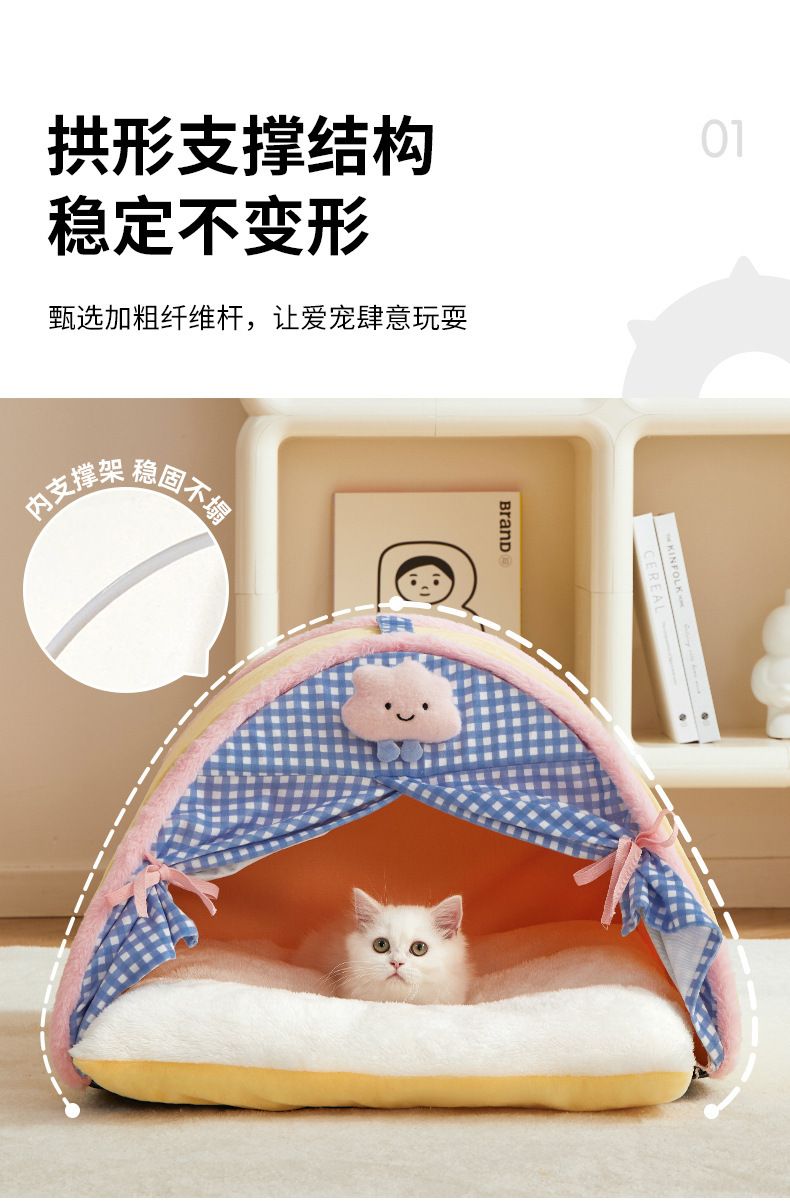 Door curtain tent pet nest, providing pets with a closed sense of security; Arched support structure, stable and non deformable; Double door curtain design, providing windproof and light blocking comfort and concealment; Three sided enclosure for warmth, 360 ° wrapped tent nest; Large space, filled with high rebound PP cotton, rolling without pressure. |