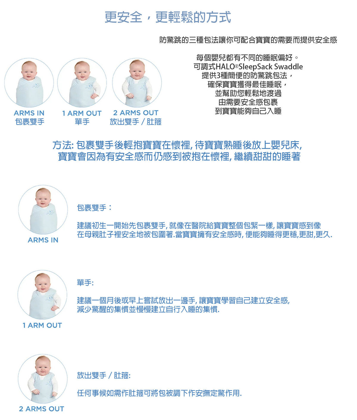 The HALO®SleepSack Swaddle has three methods of swaddling so that you can meet your baby's needs and provide a sense of security. Every baby has different sleeping preferences. Adjustable HALO®SleepSack Swaddle ensure your baby gets the best sleep and help you get through easily. From the need of security to the baby being able to fall asleep on his own.