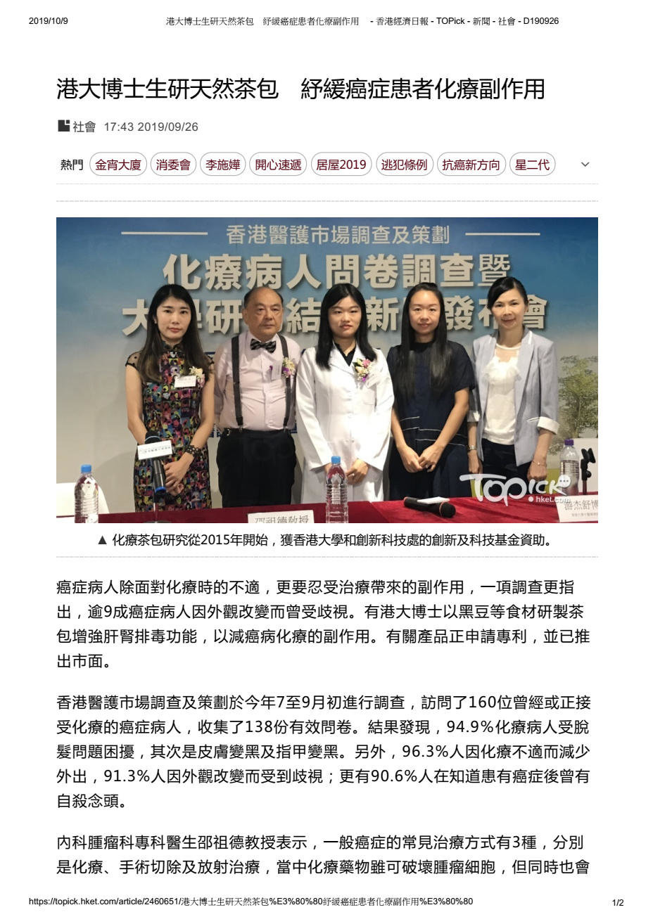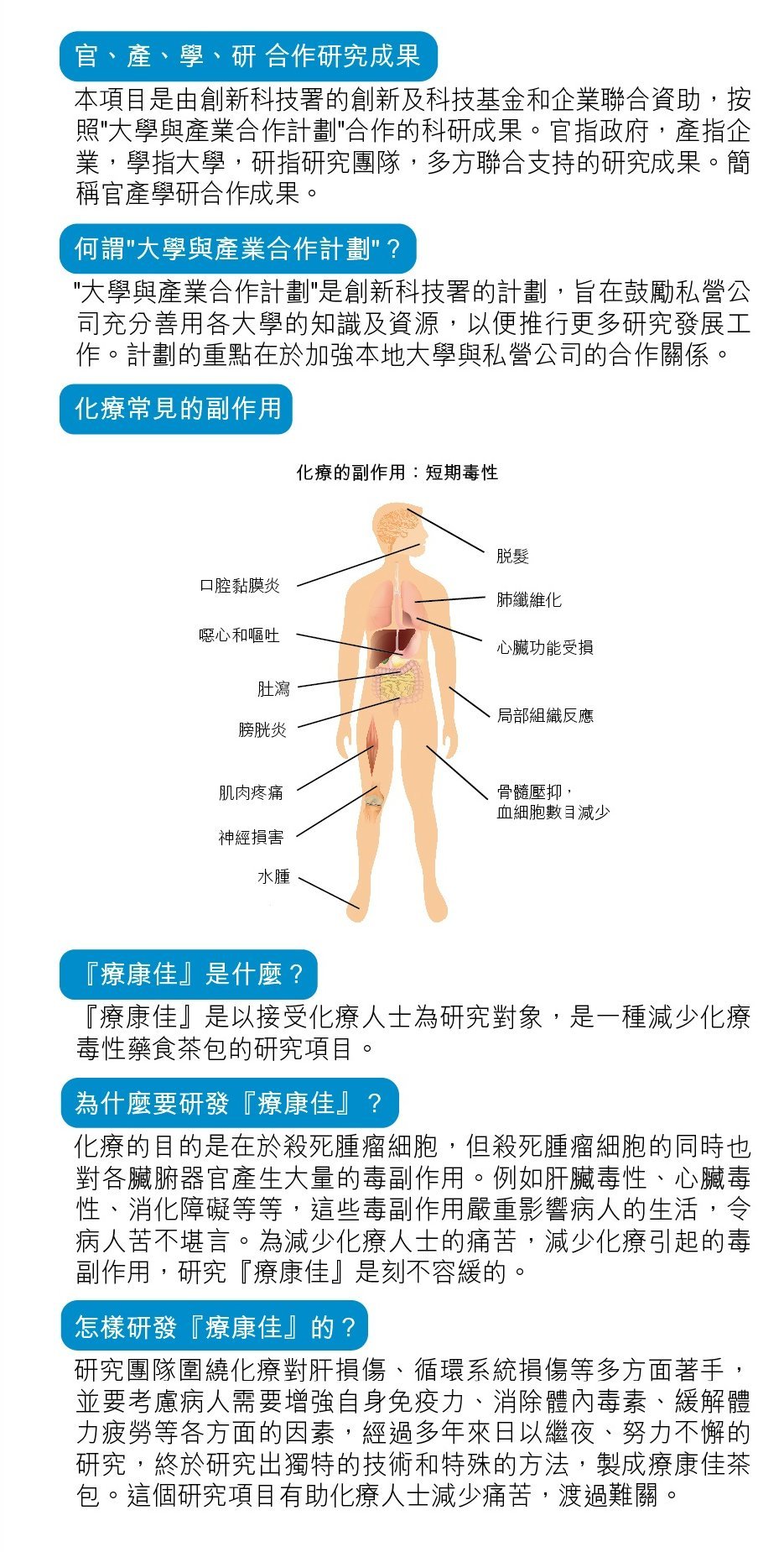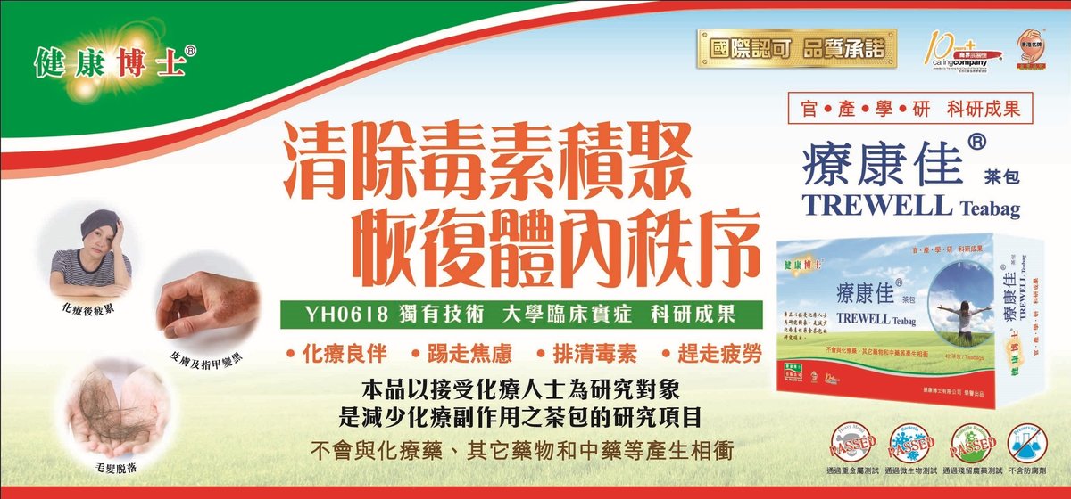(健康博士)療康佳YH 0618茶包是一款安全、有效及獨特,並可與化療藥同服的醫食同源茶包,用於“減少化療副作用的藥食茶包”,並由香港著名權威大學在創新科技署和企業的支持下研發的成果。是唯一由官方支持、大學研發及已被臨床証實有效的藥食茶包。