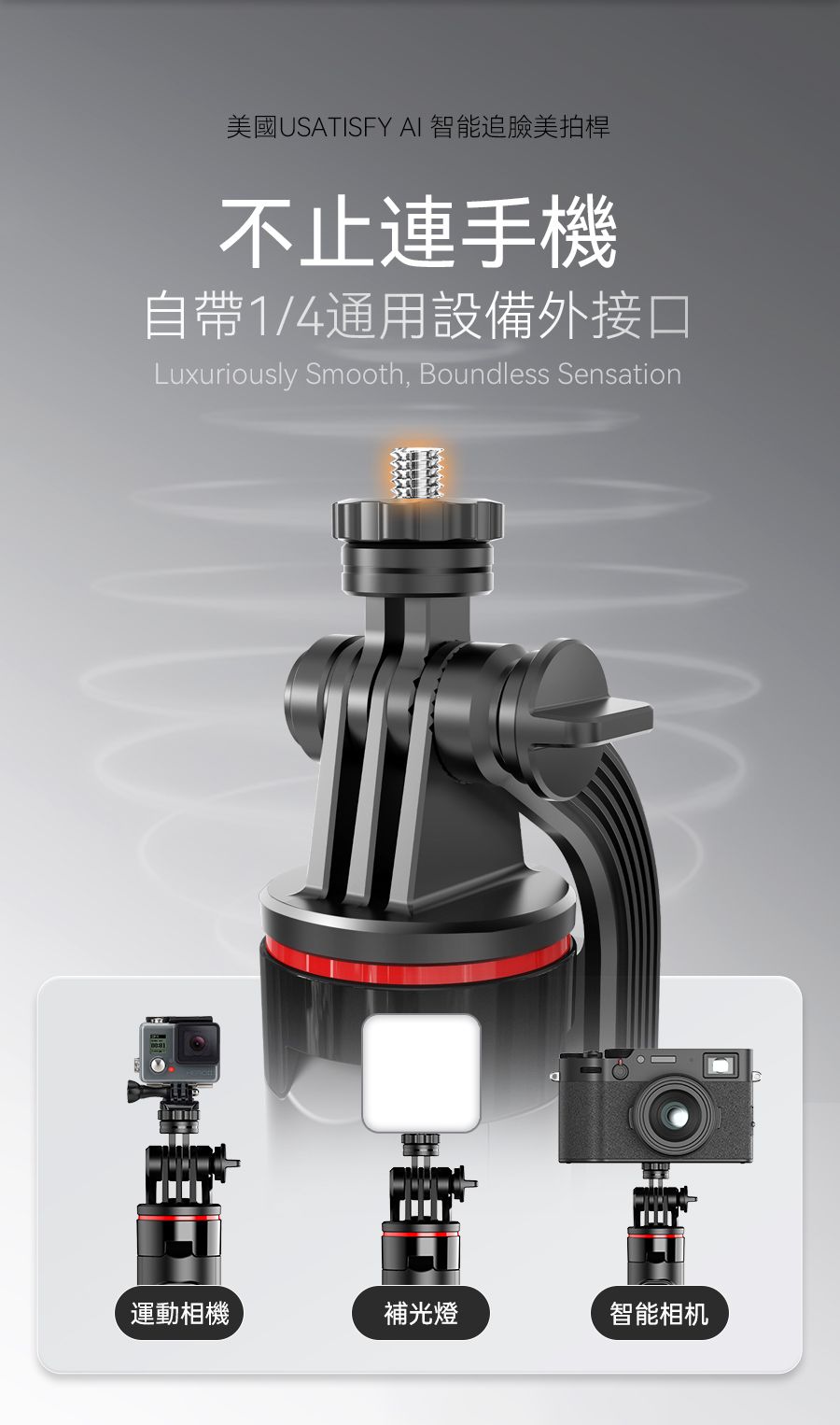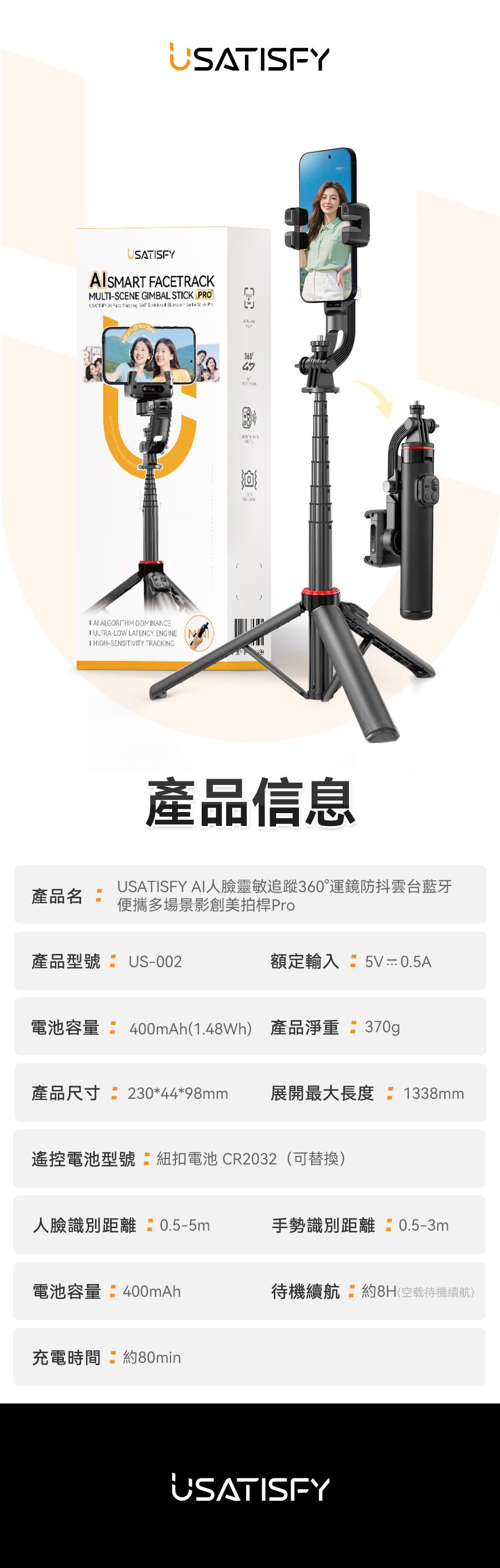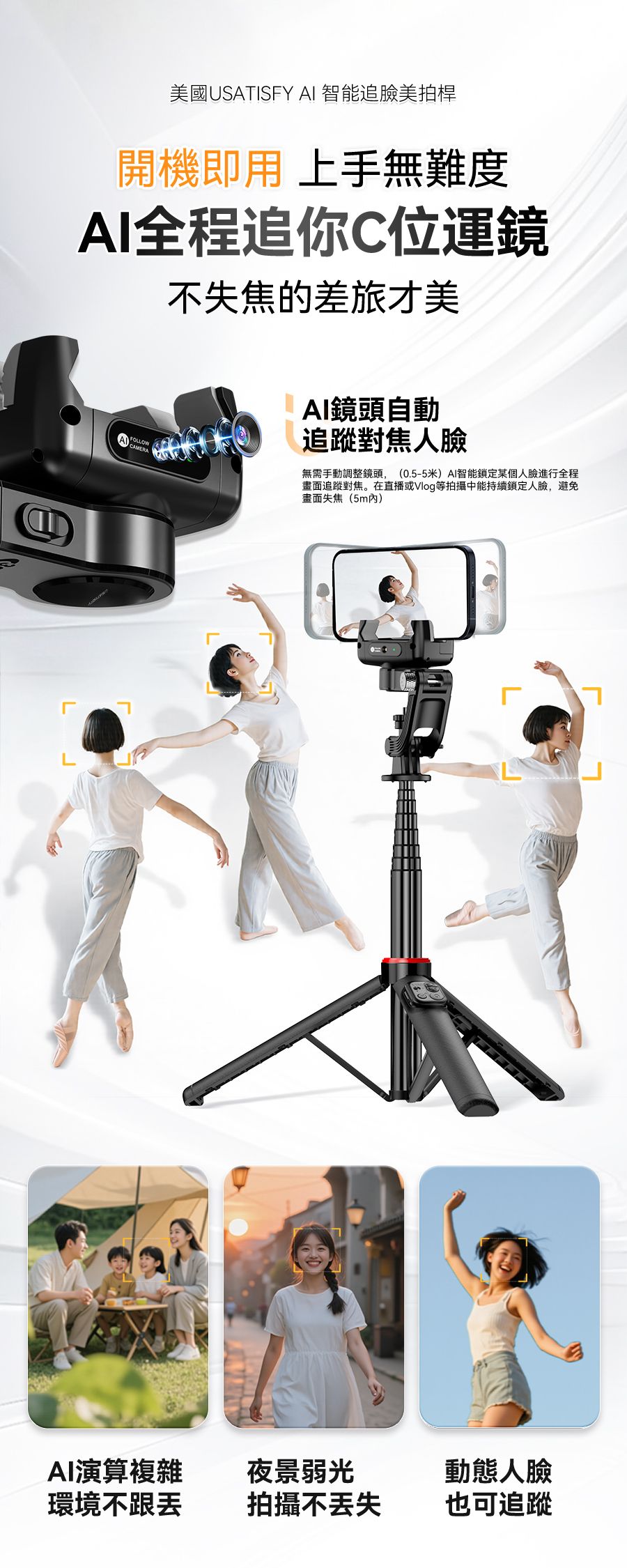 1.行業創新性AI自動人臉追蹤技術,高清原相機零延遲隨時捕捉最美角度與瞬間,獨立鏡頭無需搭配APP即刻啟用。 2.AI自定位技術搭配智能防抖動雲台,支持360°無限位旋轉,俯仰前後軸270°旋轉,消除機械限位帶來的卡頓感,適合拍攝創意轉場、環繞視角等專業畫面,降低手動運鏡門檻。 3.搭載mini可拆卸藍牙遙控器,可控制雲台轉動讓動態畫面更平滑更具沉浸感更有創意,可一鍵生成電影級動態效果。 4.獨家專利多角度夾取,夾扣豎拍橫拍俯拍。 5.內置AI智能專業模版讓新手零拍攝基礎拍攝出大片,小白用戶可快速套用模板,通過AI自動剪輯快速成片。 6.伸長後等身高直立,滿足多場景使用。折疊後大小迷你,可放入隨身包。 7.自帶1/4通用電子設備外接接口,多設備使用。通用接口,可適配運動相機、補光燈、麥克風等,實現更專業的拍攝、直播一體架應用。 8.航空級鋁合金拉桿與加大面積穩固三腳架結構,應對多種複雜地貌及天氣,也穩固不倒。