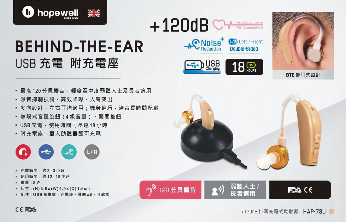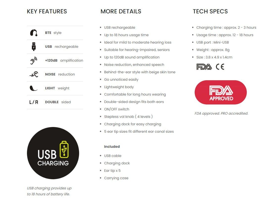 USB rechargeable BTE hearing aid. Charging dock for easy charging. Improves hearing for mild to moderate hearing loss.