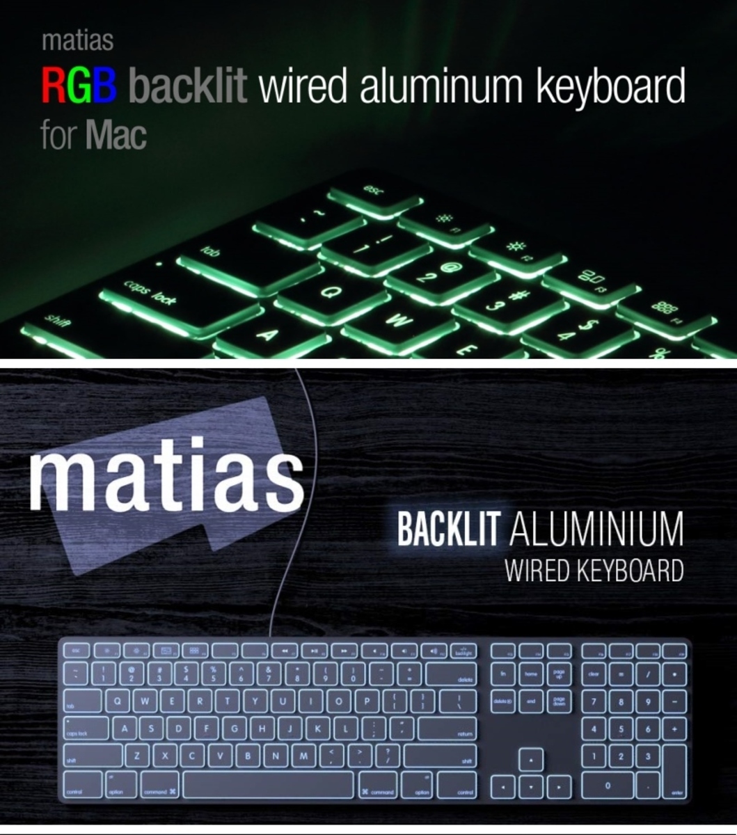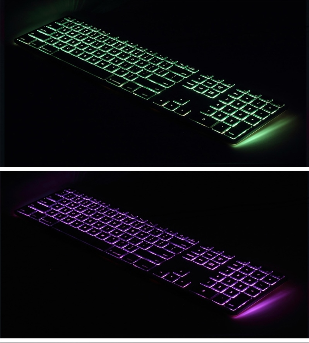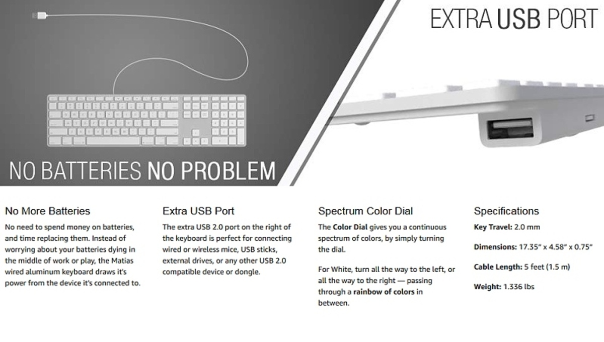 Matias RGB Backlit Wired Aluminum Keyboard for Mac is an enhanced USB keyboard. It has the reliable and traditional USB 2.0 connection, with a 1 port USB 2.0 hub, numeric keypad, classic aluminum frame, and all the special Mac functionality you expect on the function keys. However, it also has RGB backlighting; this means you can turn on backlighting for times where you want more light, and use the convenient color control dial to choose any color you want for the backlighting. Perhaps you would like your white backlighting to have reduced blue in it, to avoid disrupting your sleep, or perhaps you want your backlighting to be red, green, blue, yellow, magenta, or any other color to express your individuality. You just rotate the color control dial on the Matias keyboard to change the color. No software is needed.