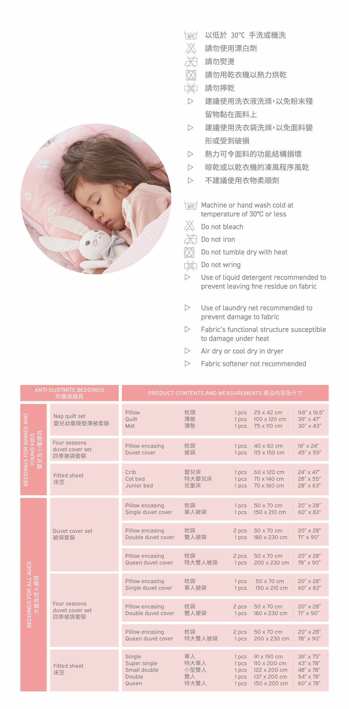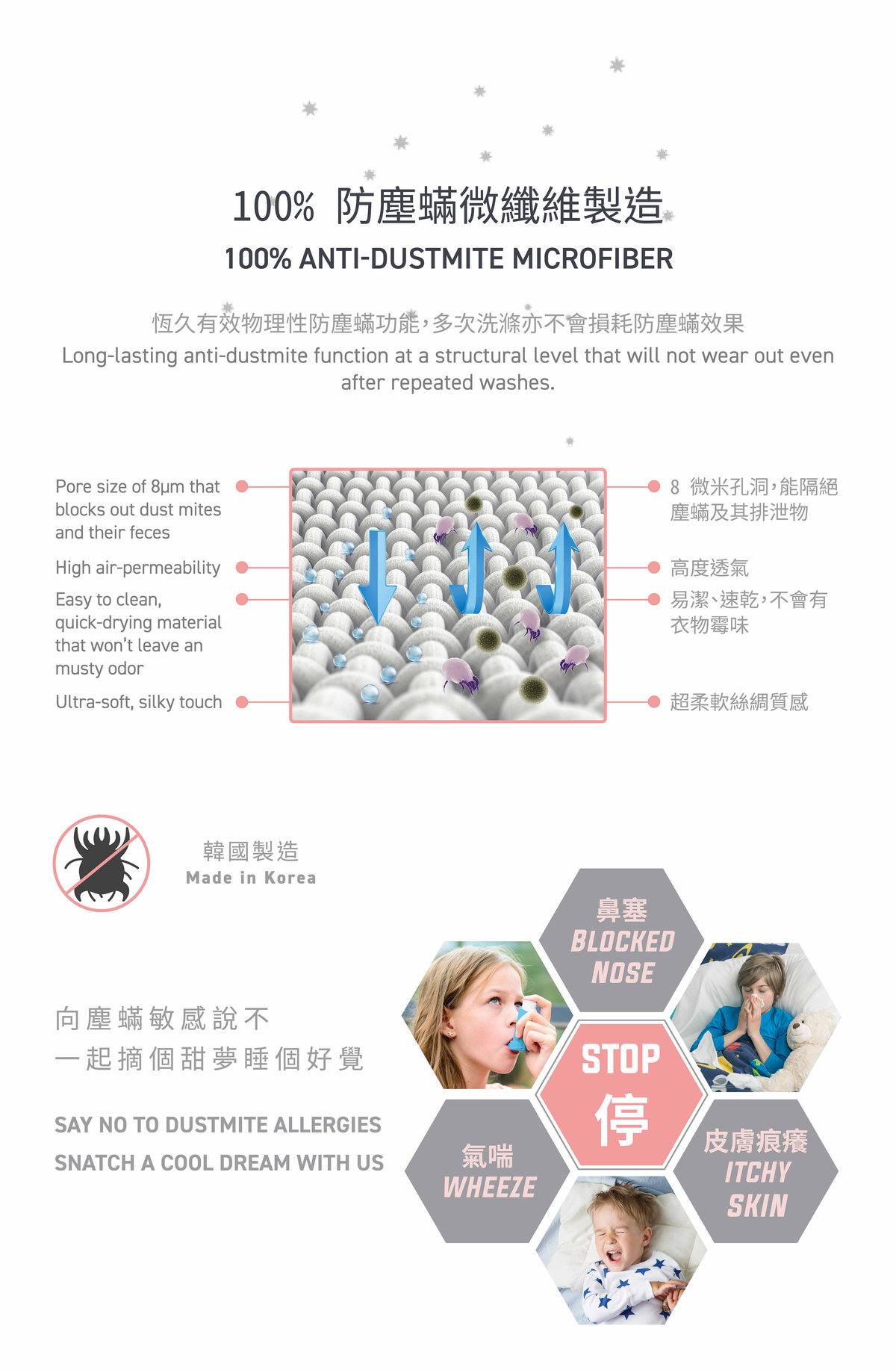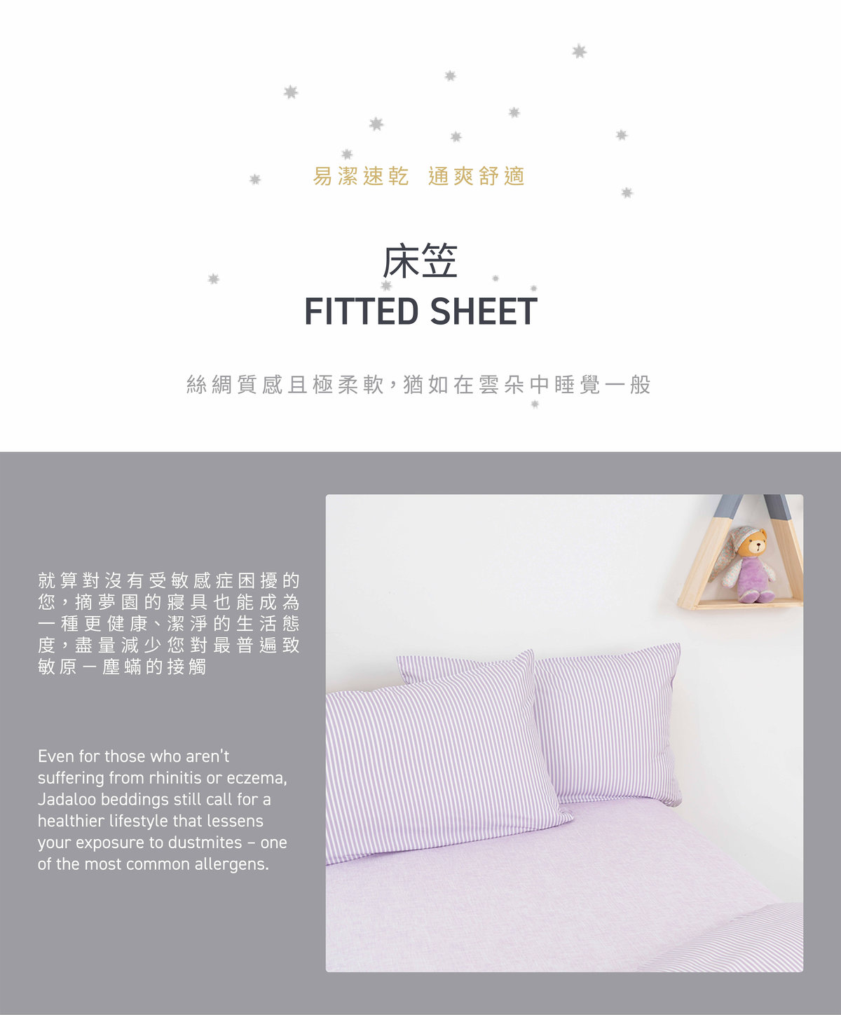 Jadaloo anti-dustmite fitted sheets are a perfect complement to the cheerful bedding sets. They are made from microfiber fabric that can effectively root out dustmites and their feces from settling inside the beddings, thereby eliminating the key allergens that cause atopic eczema, rhinitis and asthma. Moisture from perspiration can be efficiently evaporated, leaving the beddings dry and cozy throughout the night.