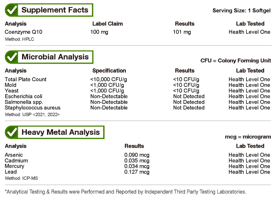 · California Gold Nutrition CoQ10, 100 mg · 100 mg, USP Grade Ubiquinone (CoQ10) Produced by Fermentation♦ · Supports Healthy Mitochondrial Function* · Supports a Healthy Cardiovascular System* · TapiOgels™ Tapioca Veggie Softgels · Suitable for Vegetarians and Vegans · Formulated without Gluten, GMOs, or Soy · Produced in a 3rd Party Audited cGMP Registered (Certified) Facility · 100% Gold Guarantee |