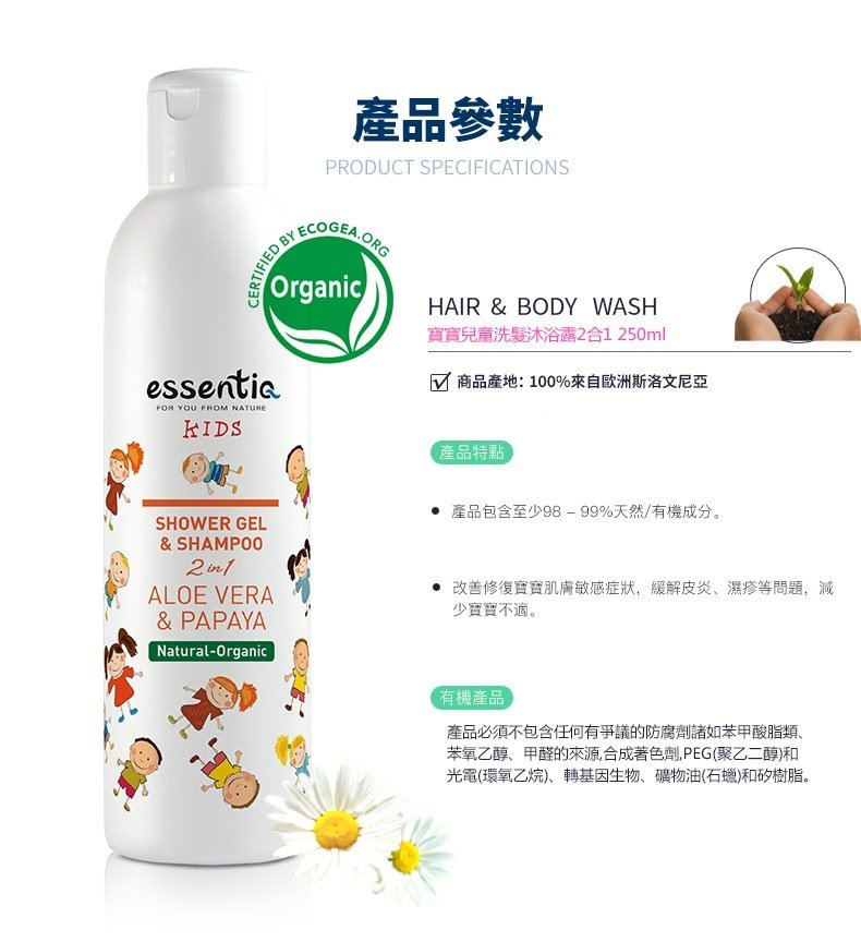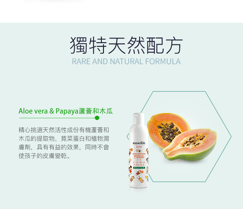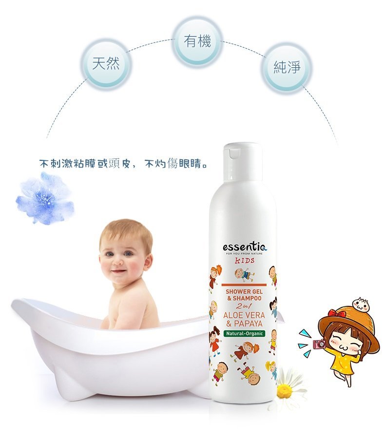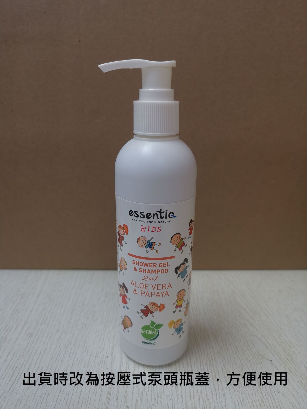 1. Shower gel and shampoo two in one, convenient for use. 2. Contains organic aloe vera to prevent skin inflammation and is also hypoallergenic. 3. Contains organic aloe vera and papaya extract, amaranth protein and plant emollients, which can clean and moisturize the skin. 4. Fresh fruity scent brings pleasant feelings of joy. 5. 99% natural extract, suitable for sensitive skin. Remarks : When delivered, the bottle cap is changed to a push-type pump head for convenience. |