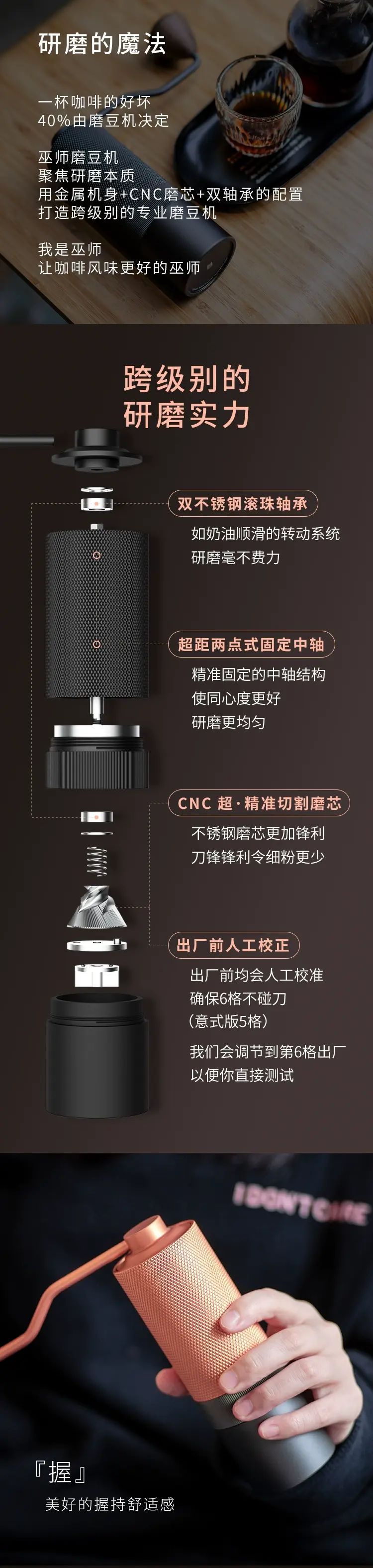 Description A high-precision CNC-machined manual grinder. The Wizard 2.0 is designed for coffee enthusiasts, capable of grinding for everything from espresso to pour-over with exceptional consistency and control. Wizard 2.0 - All-Round Edition (Obsidian Black)