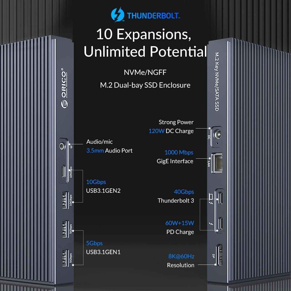 Product Model:ORICO-TB3-S2 Name:Thunderbolt 3 M.2 Dual-bay Docking Station Material:Aluminum Alloy Color:Gray Support Dual SSD Build-in Slot:M.2 (NGFF*1 + NVMe *1) Dual protocol Theoretical Transmission Speed:40Gbps MAX Dimension:188mm(L)*95mm(W)*24mm(H) Support SSD Capacity:Maximum 4TB (Theoretical) Power Adapter: 24V5A 120W Support Protocol:NVMe/NGFF Support System:Windows / Mac |