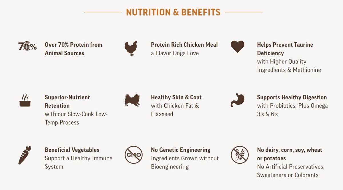 Ingredients: Chicken Meal, Lentils, Field Peas, Chickpeas, Chicken Fat (preserved with Mixed Tocopherols), Tapioca, Flaxseed Meal, Dried Apple Pomace, Dried Carrots, Natural Chicken Liver Flavor, Menhaden Fish Meal, Suncured Alfalfa Meal, Dried Kelp, DL-Methionine, Monosodium Phosphate, Choline Chloride, L-Lysine, Calcium Carbonate, Vitamin E Supplement, Dried Lactobacillus acidophilus Fermentation Product, Dried Bacillus subtilis Fermentation Product, Dried Bifidobacterium longum Fermentation Product, Dried Enterococcus faecium Fermentation Product, Niacin, Zinc Sulfate, Ferrous Sulfate, Riboflavin, Copper Proteinate, Manganese Proteinate, Vitamin A Supplement, Copper Sulfate, d-Calcium Pantothenate, Vitamin B12 Supplement, Manganese Sulfate, Biotin, Vitamin D3 Supplement, Cobalt Proteinate, Thiamine Mononitrate, Folic Acid, Sodium Selenite, Calcium Iodate.