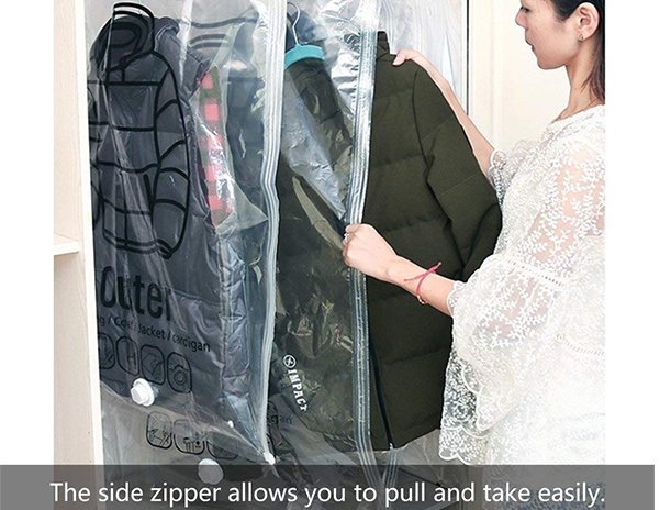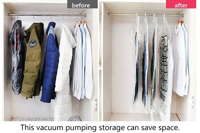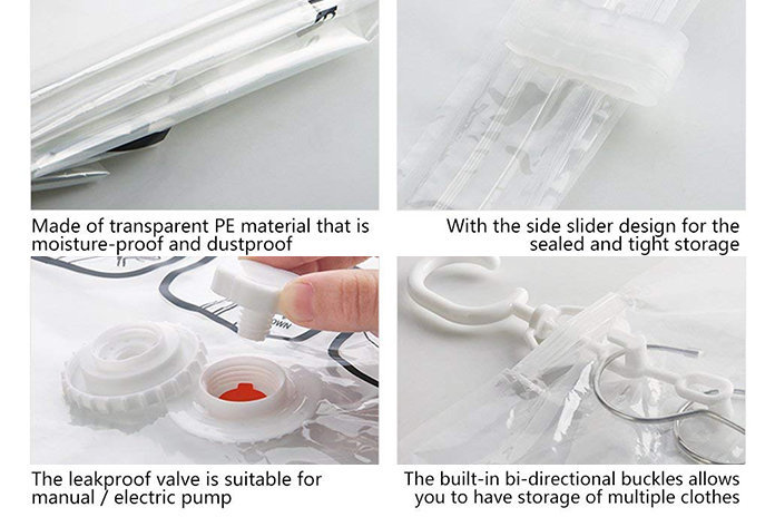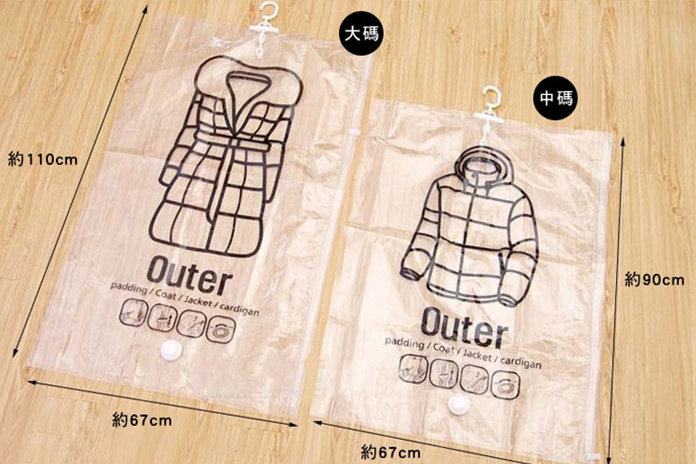 節省空間,防潮、防蟲、防細菌 適合存放禮服或外套,使收納空間增大 2-3 倍 每包可容納約 3-4 件連衣裙或大衣 不透氣及防水密封,不會讓衣物沾上水份及污垢 節省存儲空間 透明設計,可輕易翻找衣物 * 此產品不包括任何真空壓縮泵(圖片中的泵僅用於攝影/示範) |