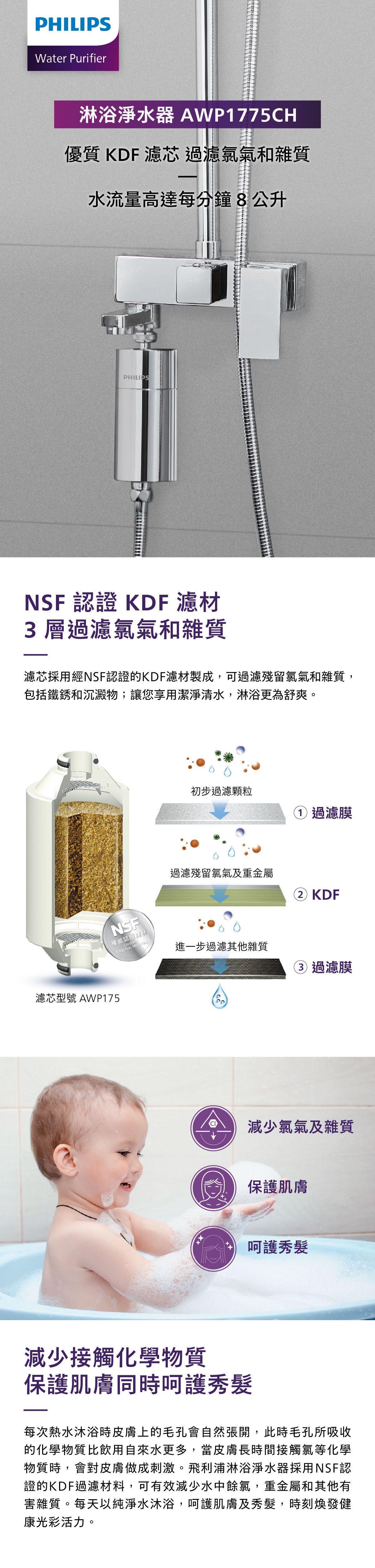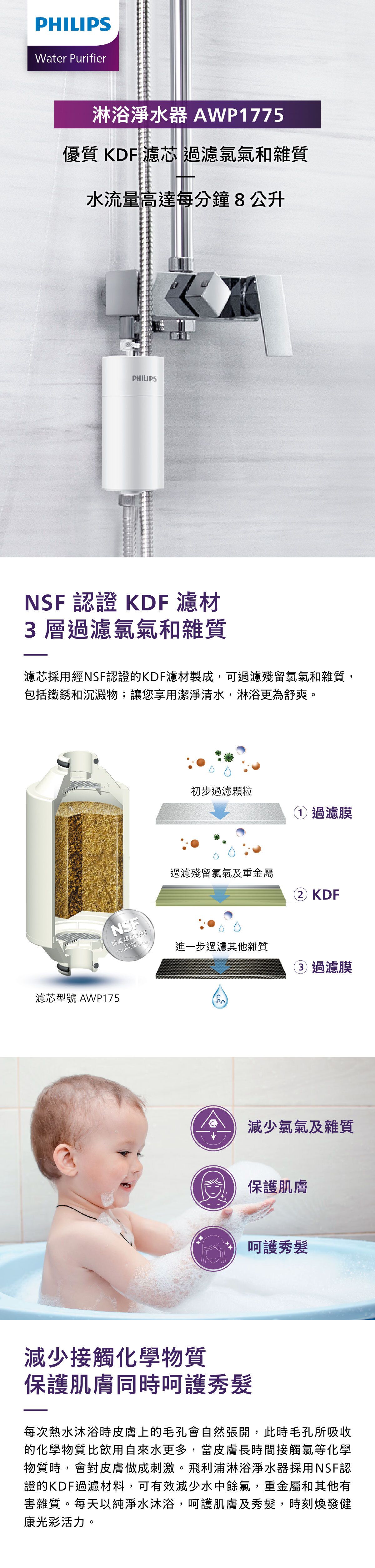 • NSF-certified KDF filter media effectively inhibits bacteria and filters residual chlorine, particulate impurities, heavy metals, and foreign colors and odors • Protect your hair – Filters out residual chlorine and impurities, preventing hair from drying out • Protect your skin – avoid irritation and damage to your skin caused by residual chlorine • Filter material is certified by US NSF42 standard • 50,000 liters of purified water, long-term use (8 liters/minute)