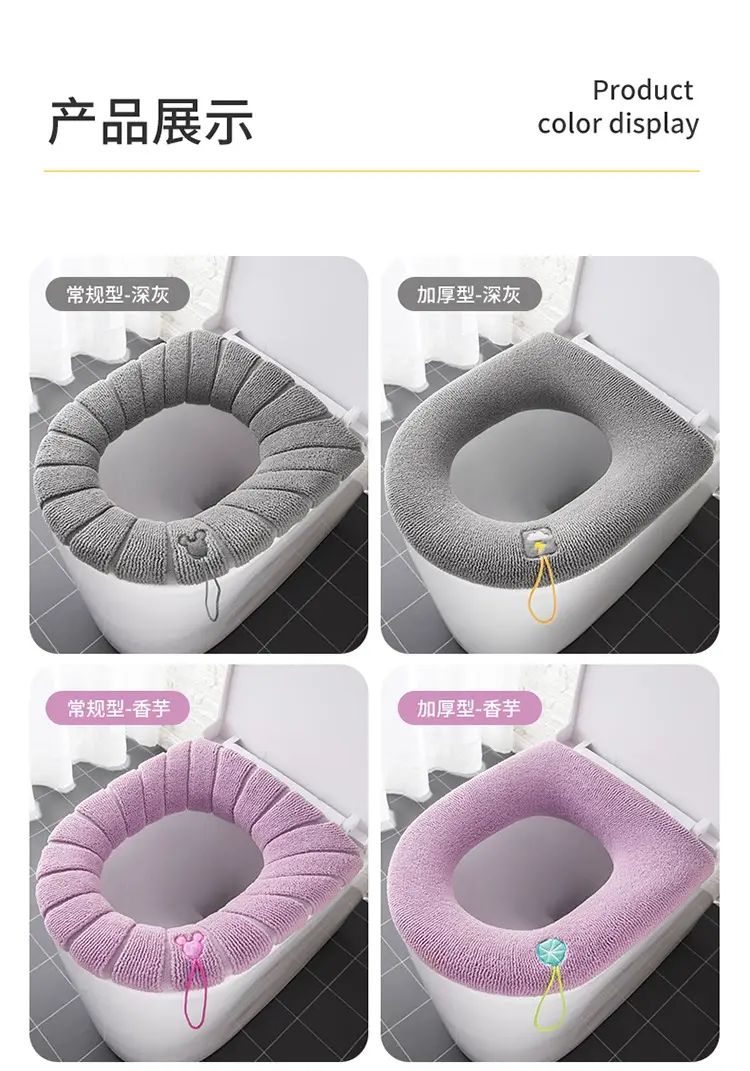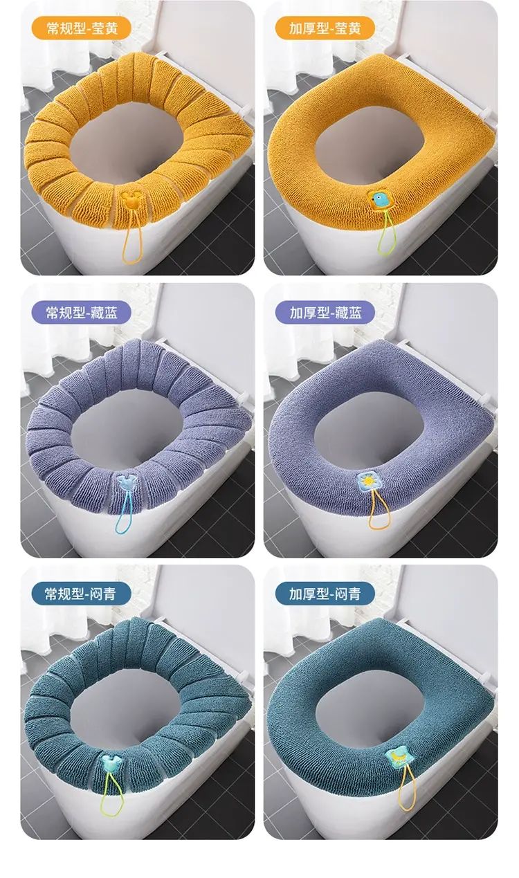 Description This toilet seat is a must-have! Its universal design allows for use in all seasons, whether cold or hot. Its thickened material provides a soft and comfortable feel, ensuring long periods of sitting without fatigue. The ring-shaped design is incredibly easy to install and easily adapts to any toilet. Its intelligent waterproof design effectively blocks moisture, leaving it feeling fresh and breathable in the summer, making bathroom breaks a pleasant and comfortable experience.