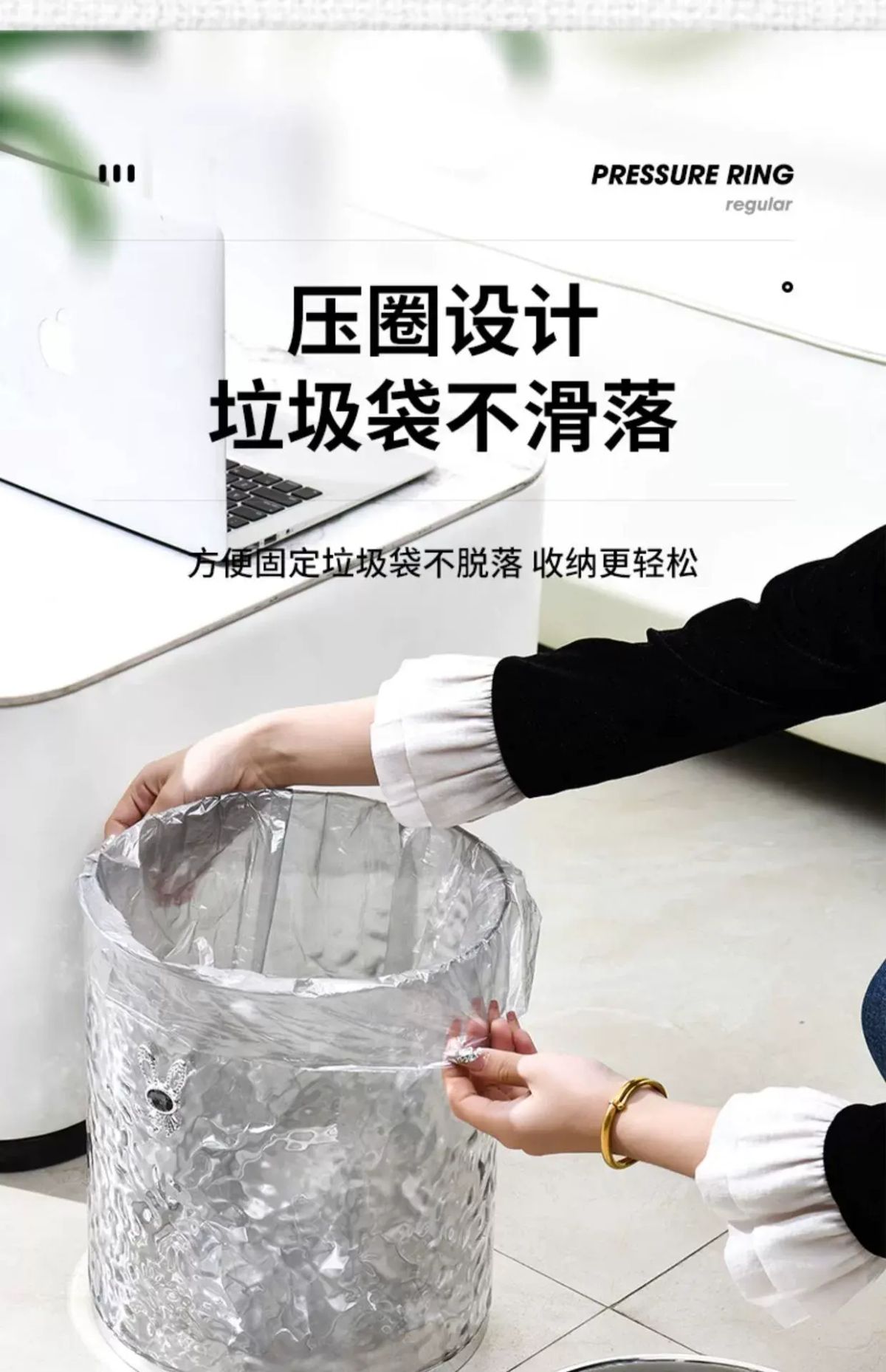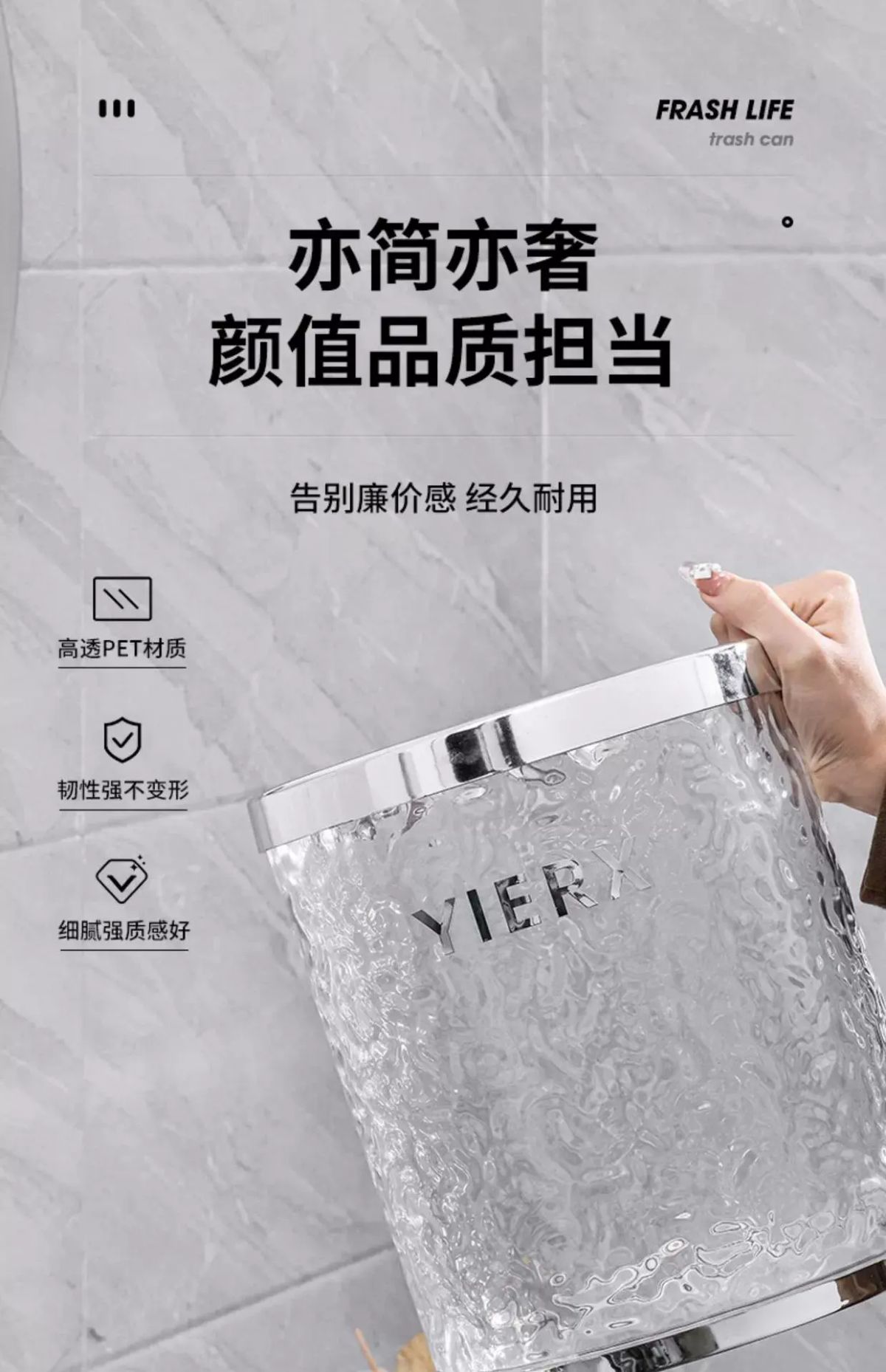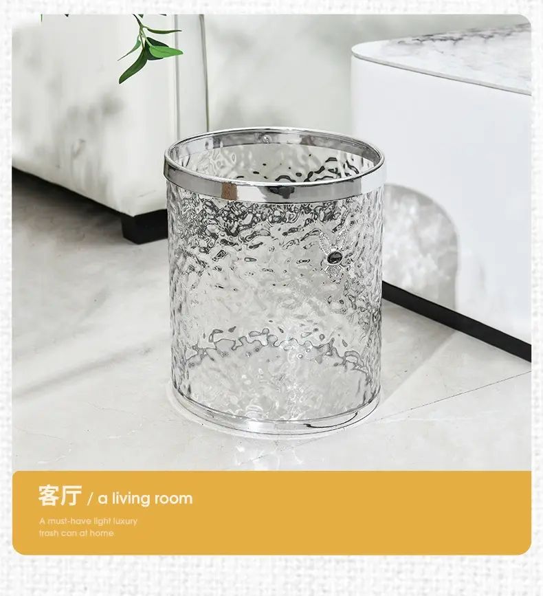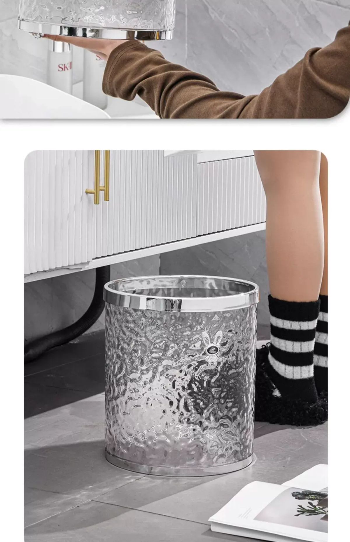 Description This trash can is a true beauty statement in your home! Its luxurious, transparent appearance adds a stylish touch to any space. Its large capacity easily accommodates even the heaviest kitchen waste. Suitable for living rooms, bathrooms, and toilets, it's moisture-resistant, durable, and easy to clean. It's both practical and enhances your home's aesthetic, making trash disposal a joy.